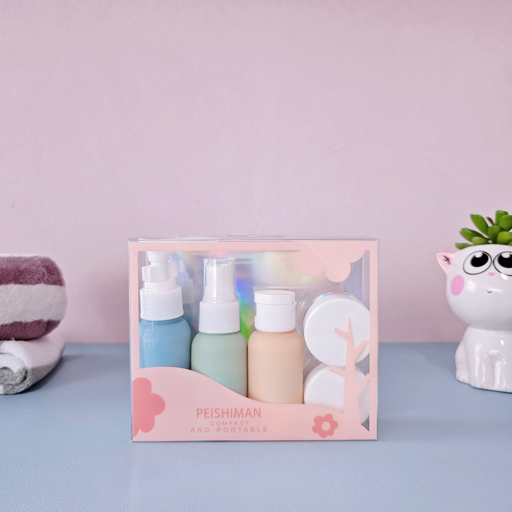 (Cada set cuenta con un dispensador, un rociador, un frasco y dos potes para cremas. Ideal para viajes y uso diario).