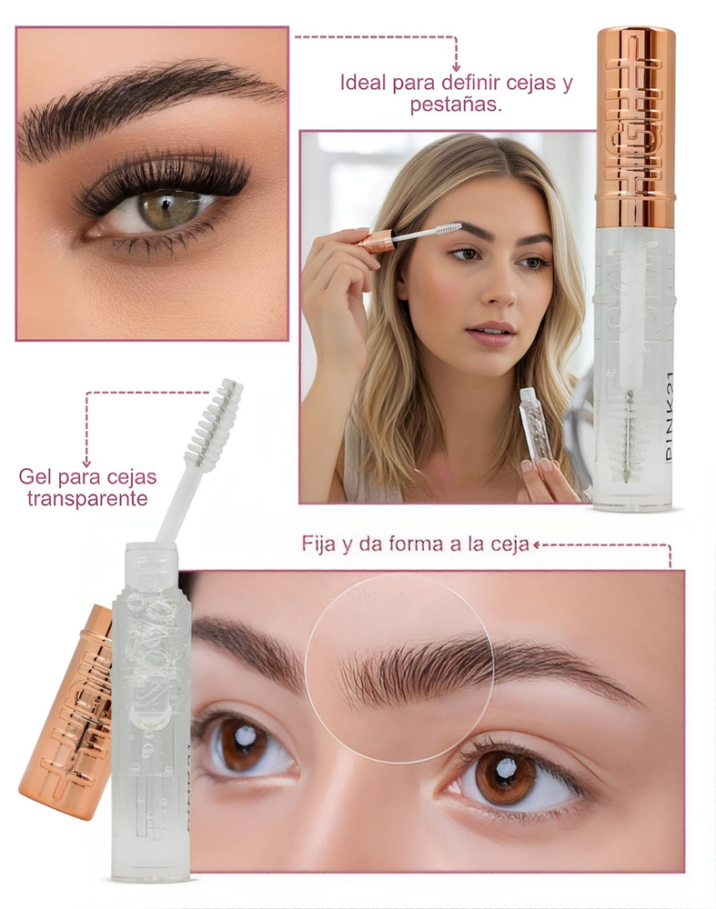 (Máscara de cejas marca "Pink 21". Perfecto para que tus cejas queden peinadas y en fijación, su aplicador es grande, es color transparente).