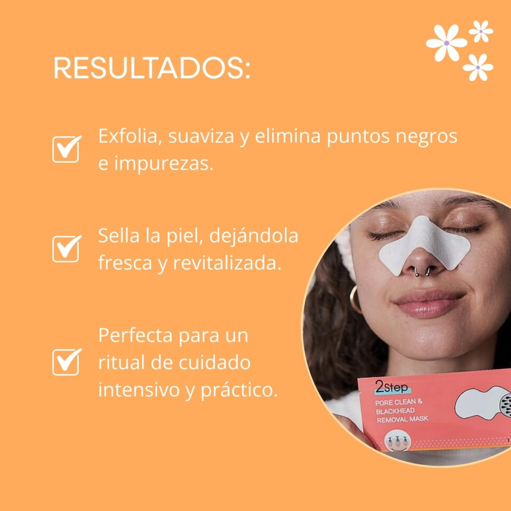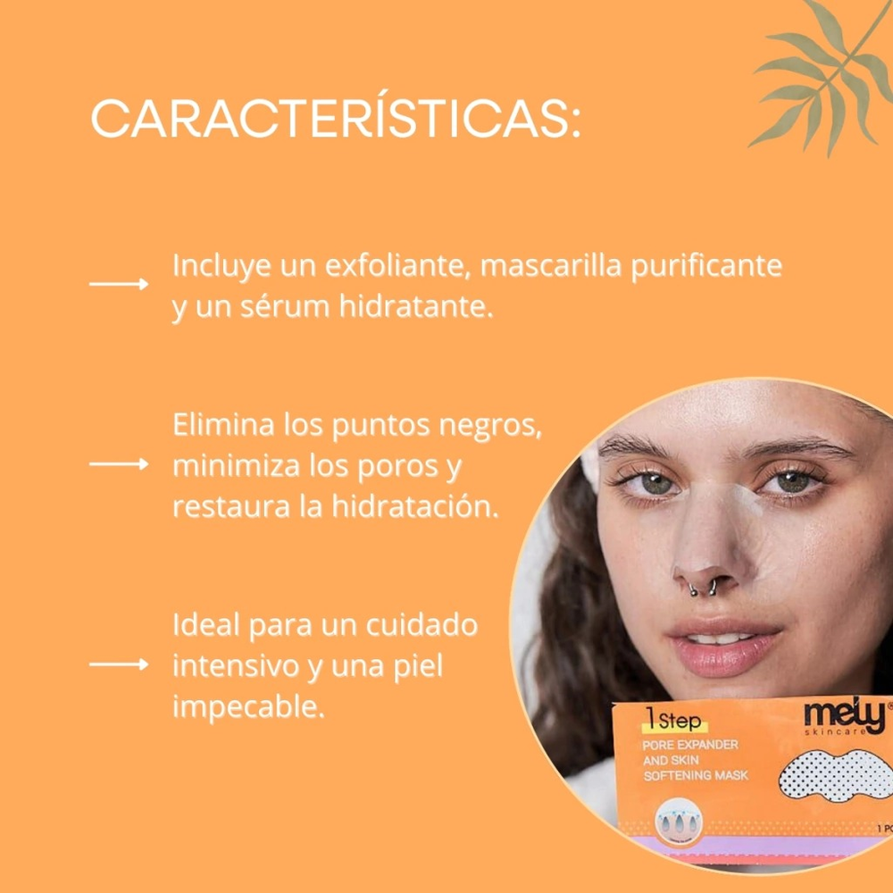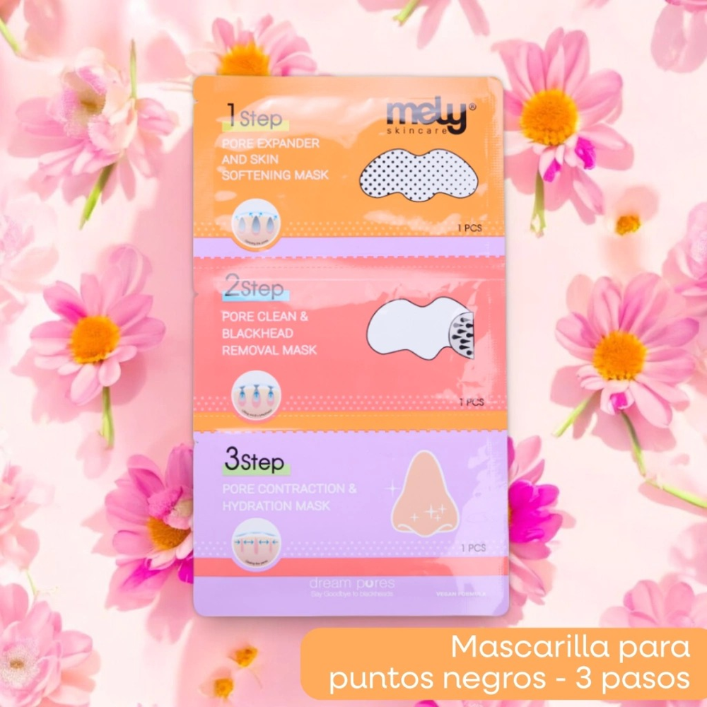 (Mascarilla para puntos negros "mely" que cuenta con tres pasos. Sirve como exfoliante, como serum e hidratante. Ideal para que no dañe tu nariz y puedas retirar esos puntitos negros cuidándotela).