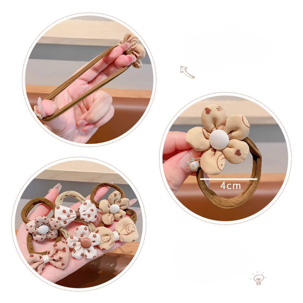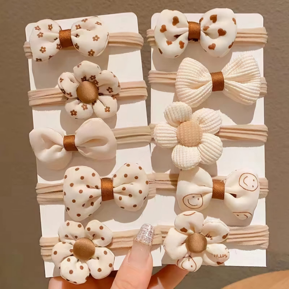 (Pack x 12 Blister de colitas en tonos marrón y blanco con diferentes diseños de moños y flores , es muy cómodo, ideal para utilizar en el día a día).