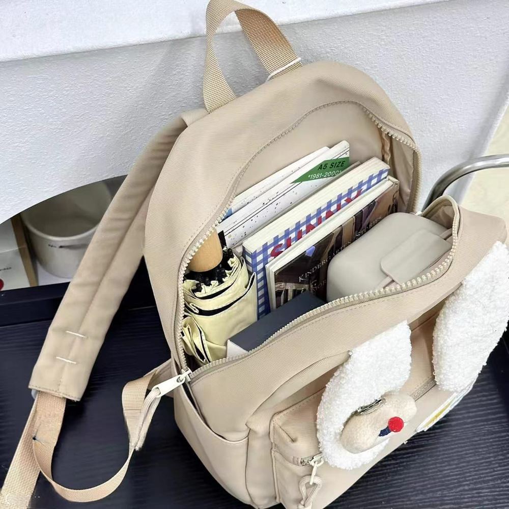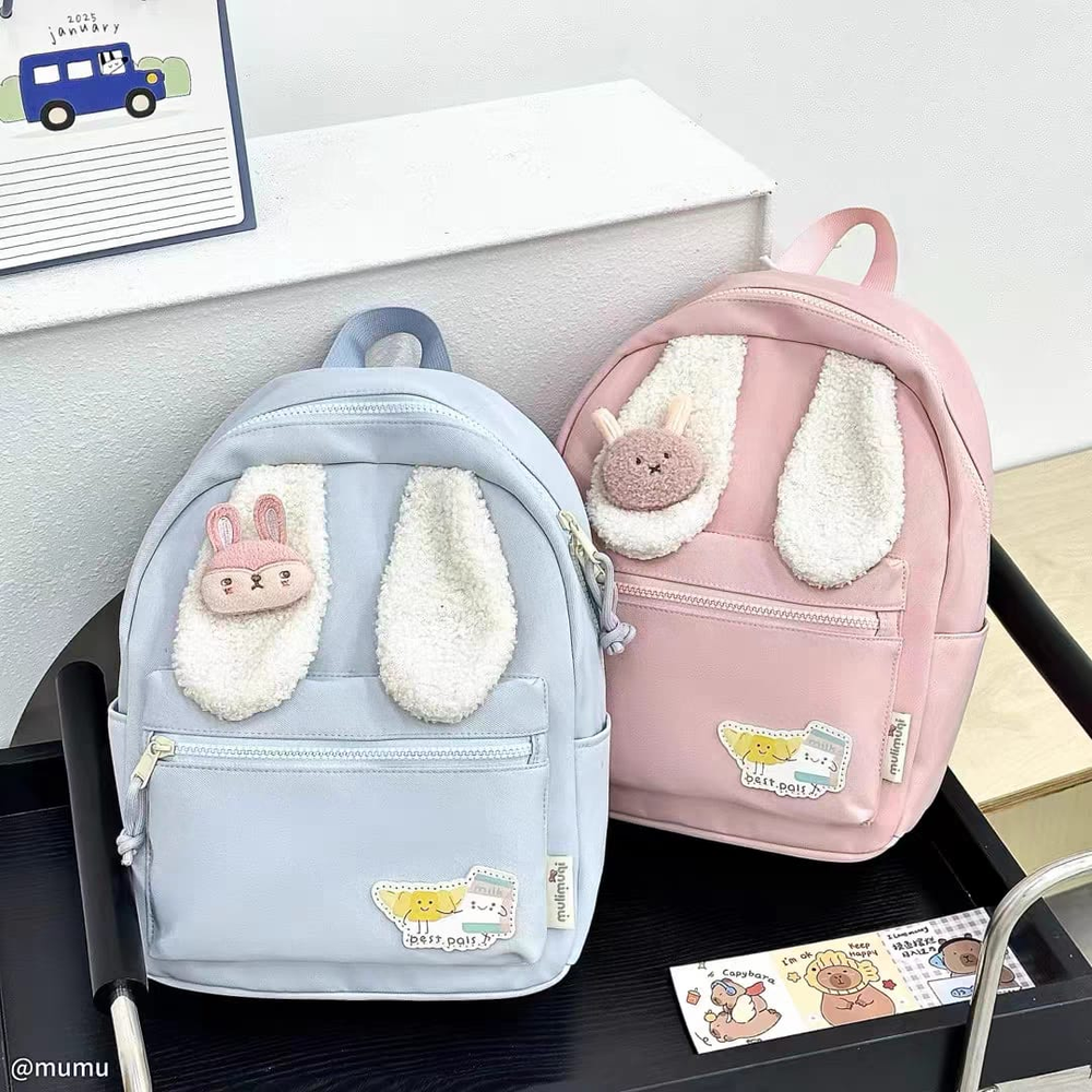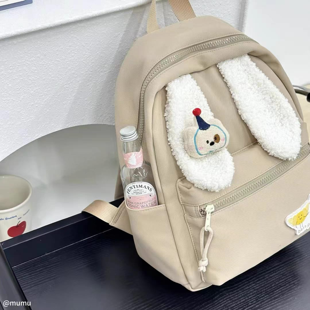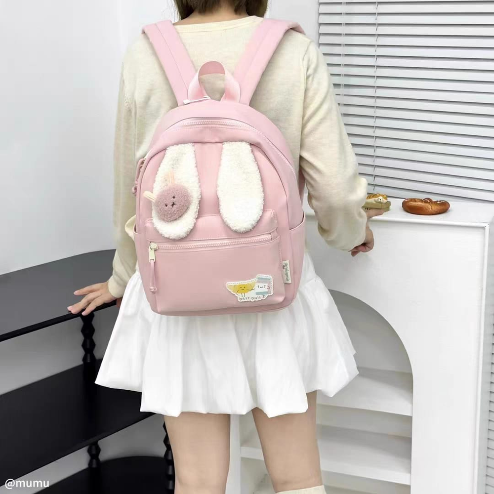 (Esta mochila cuenta con un compartimiento amplio con un bolsillo interno, dos bolsillos laterales, tiras acolchonadas y un bolsillo frontal con cierre. Hermosos diseños de orejas de peluche con pins surtidos de animales. Disponible en 4 colores).