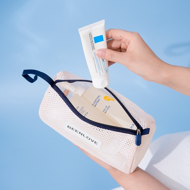 (Portacosmetico tipo bolsa de malla transparente con cierre, permite ver fácilmente el contenido. Ideal para organizar y transportar cosméticos, artículos de tocador o pequeños objetos digitales. Su diseño compacto y ligero las hace perfectas para viajes o para el uso diario dentro de un bolso o mochila).