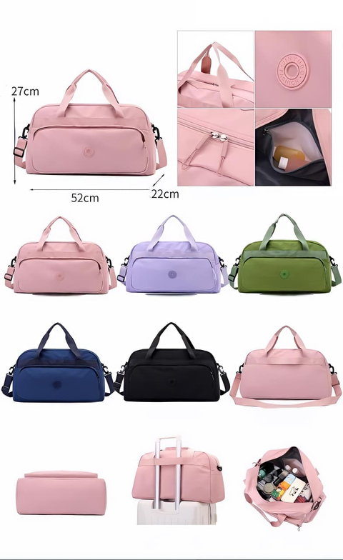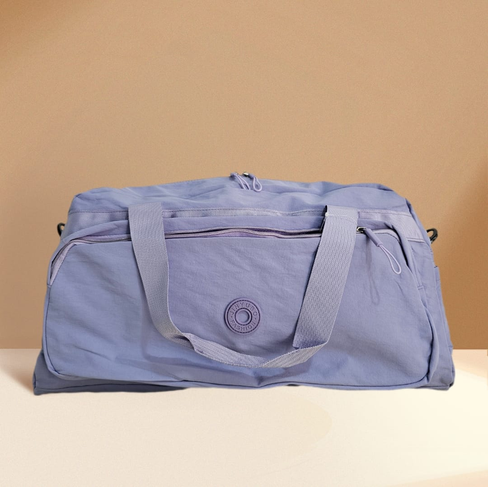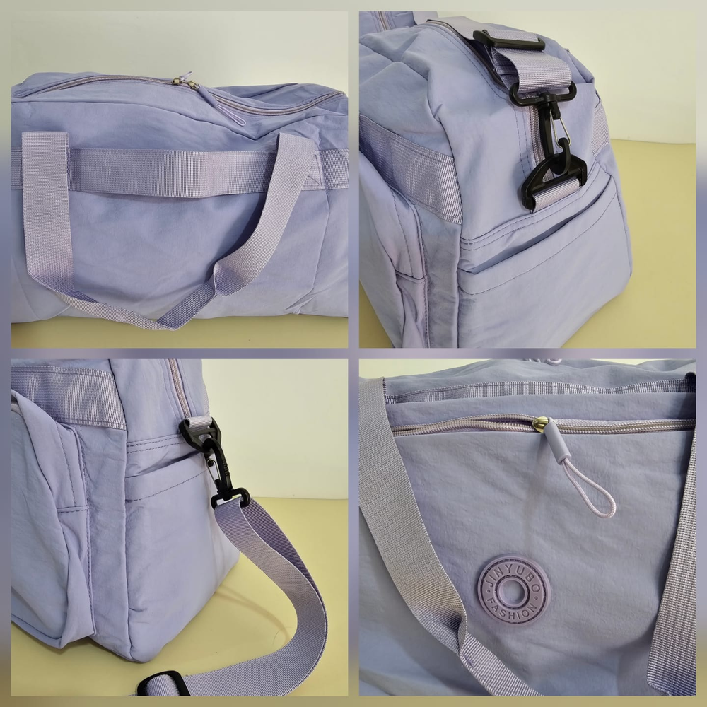 (Bolso de viaje para llevar ropa, artículos personales y otros objetos necesarios para viajes cortos, escapadas de fin de semana o como equipaje de mano en vuelos. Puede ser utilizado para diversas actividades como ir al gimnasio, practicar deportes, o como una bolsa de uso diario si se necesita llevar una cantidad considerable de objetos. Incluye correa para transportarlo y 1 bolsillo interno impermeable y 2 externos en cada costado y uno en la parte delantera para ayudar a organizar y acceder fácilmente a los artículos. Disponible en 4 colores: rosa, negro, azul y lila).