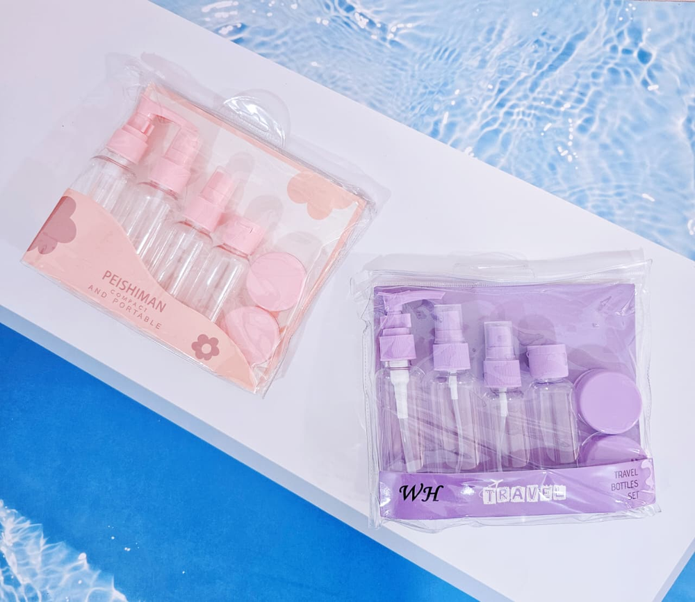 (Set x 6U. Neceser de viaje, que cuenta con un dispensador, dos rociadores, un frasco y dos potes para crema. Ideal para poder sacar el producto fácilmente presionándolo. Son super útiles a la hora de llevarlos de viaje, ya que por su tamaño no ocupan espacio). Ut29.