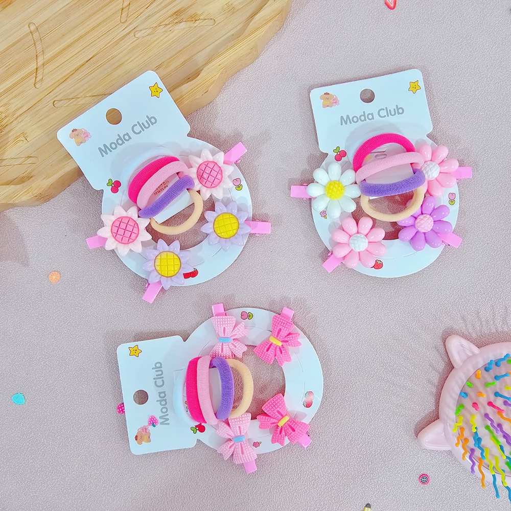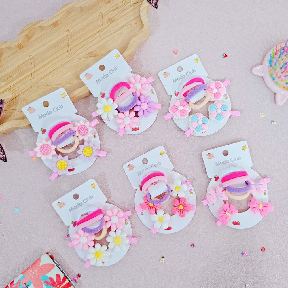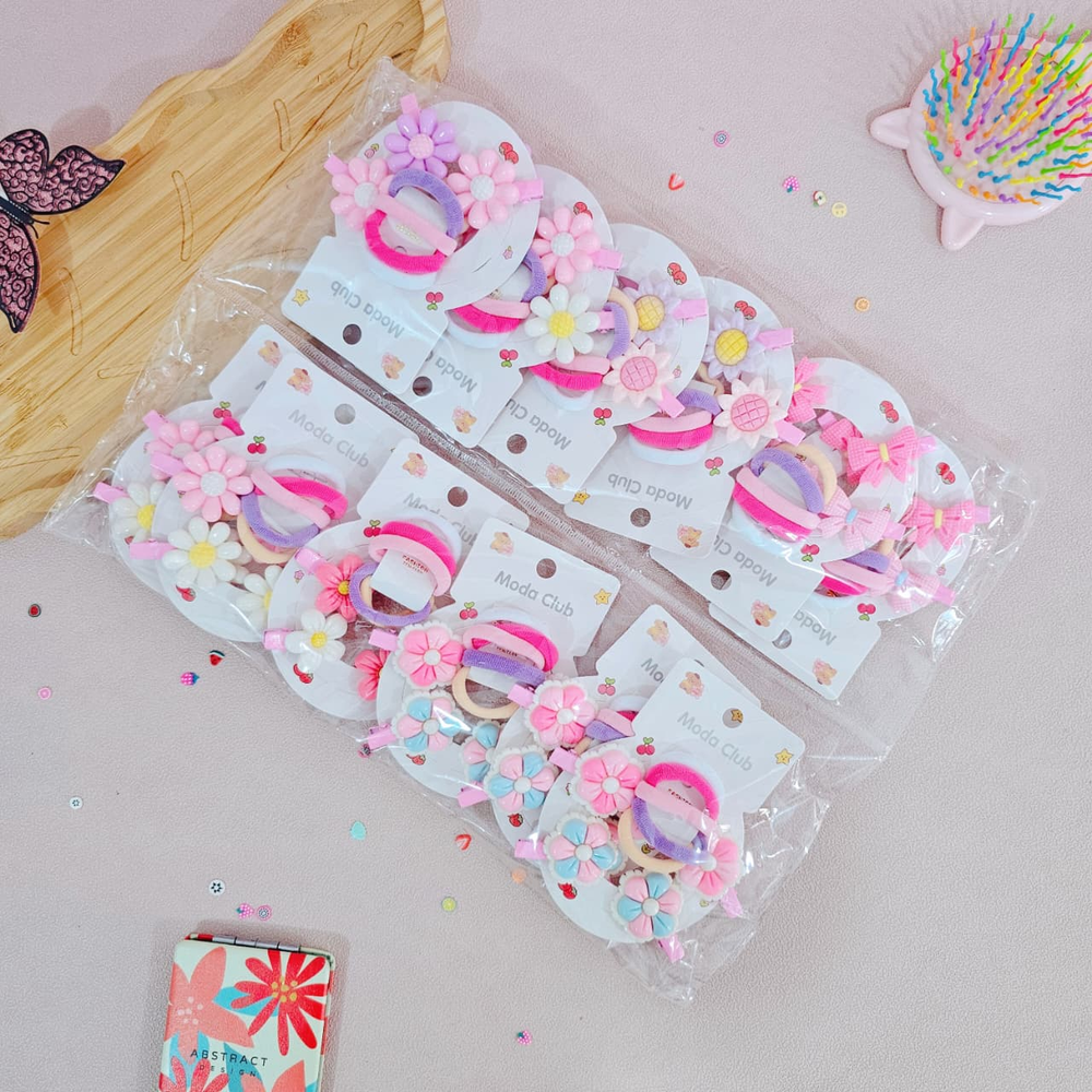 (Pack x 12 Blíster. Cada blíster cuenta con 5 colitas con diseños distintos y 2 hebillas en forma de flor o moños . Ideal para realizar peinados).