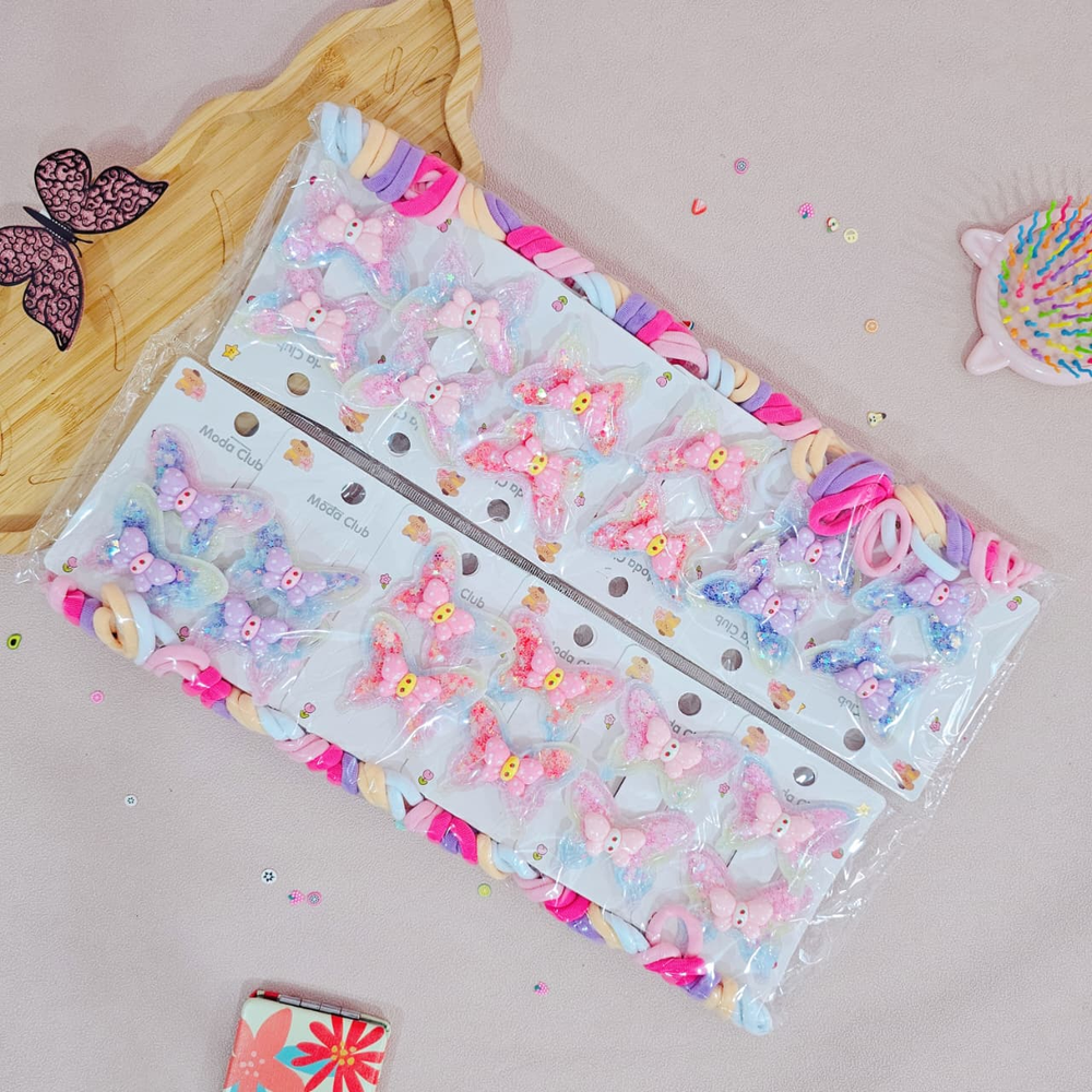 (Pack x 12 Blíster. Cada blíster cuenta con 5 pares de colitas con distintas tonalidades y hebillas de mariposa con letejuelas en su interior. Ideal para realizar peinados). (Ut. 29)