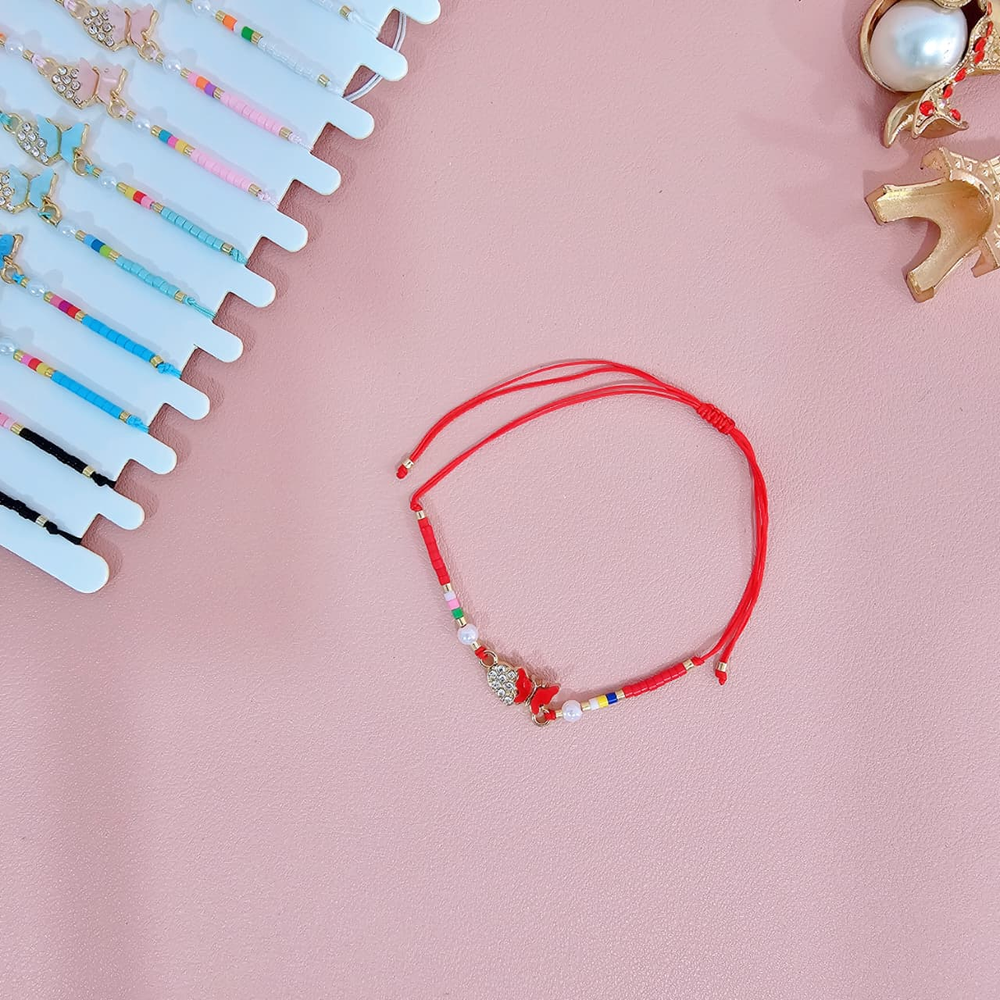 (Blíster con 12 unidades de pulseras con dije de corazón y una mariposa, en colores varios. Diseño delicado con correas ajustables.)