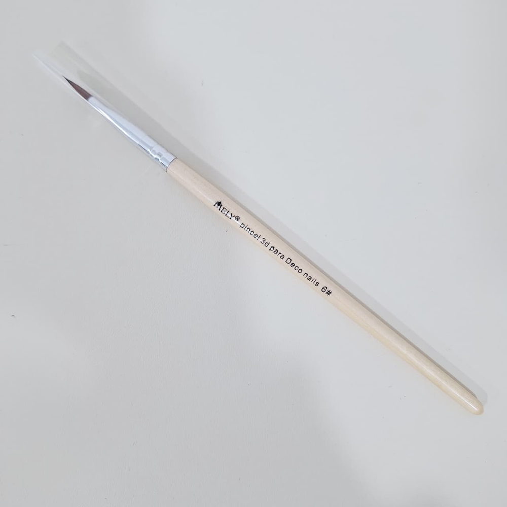 "MELY pincel 3d para Deco nails 6#" ideal para la decoración de uñas. Este tipo de pincel, con una punta fina y alargada, es ideal para dibujar líneas, patrones geométricos y otros detalles delicados. Se puede usar con esmaltes de uñas, geles y acrílicos. La forma delgada y la punta fina del pincel permiten realizar trazos muy precisos, lo que facilita la creación de diseños artísticos en las uñas.