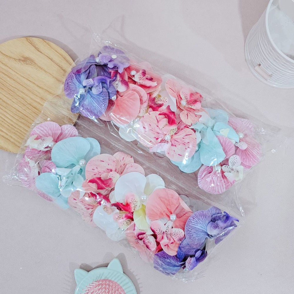(Pack x 12 hebillas con forma de flor de varios colores. Ideal para usar en cualquier evento o simplemente levantar tu look del día).