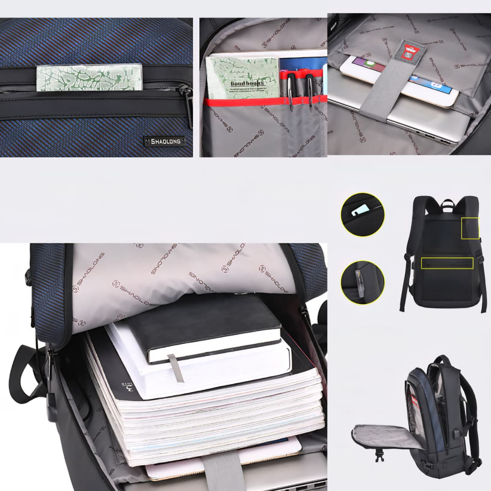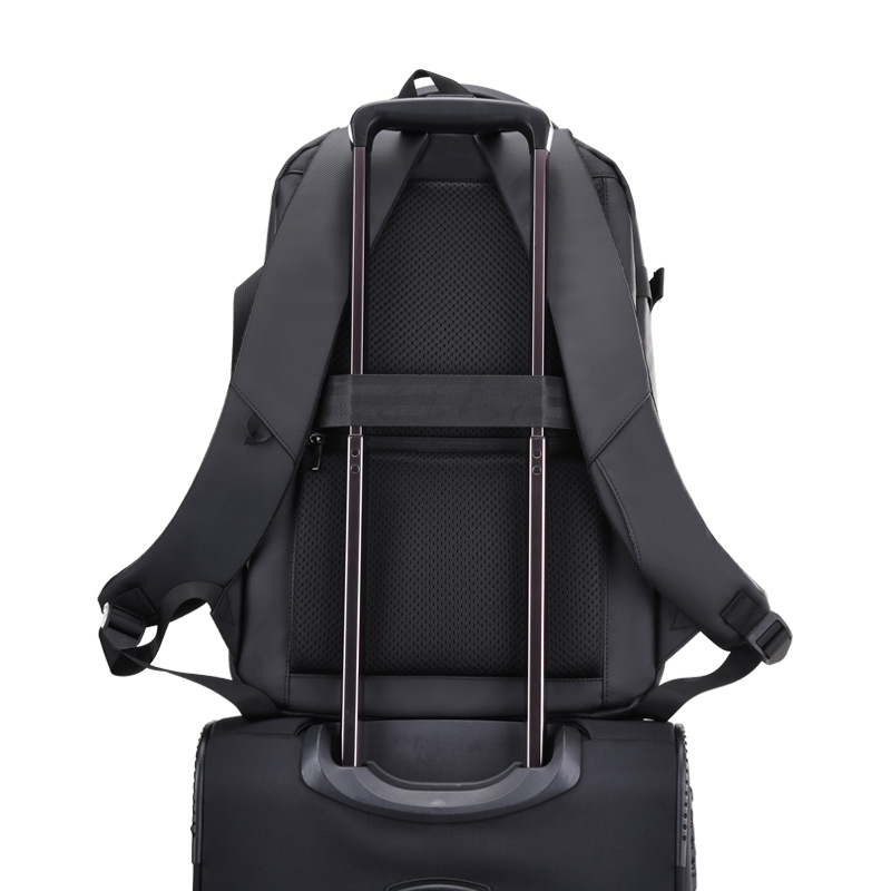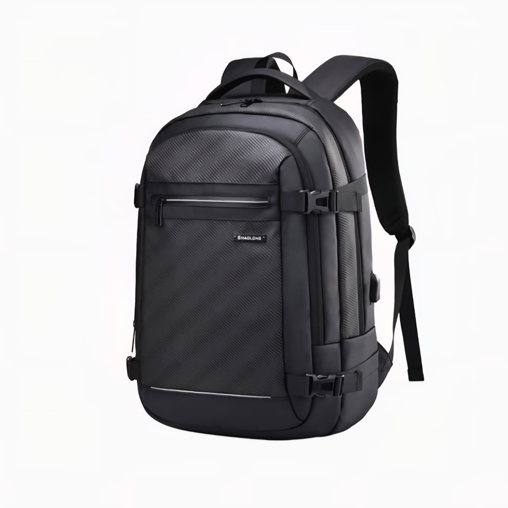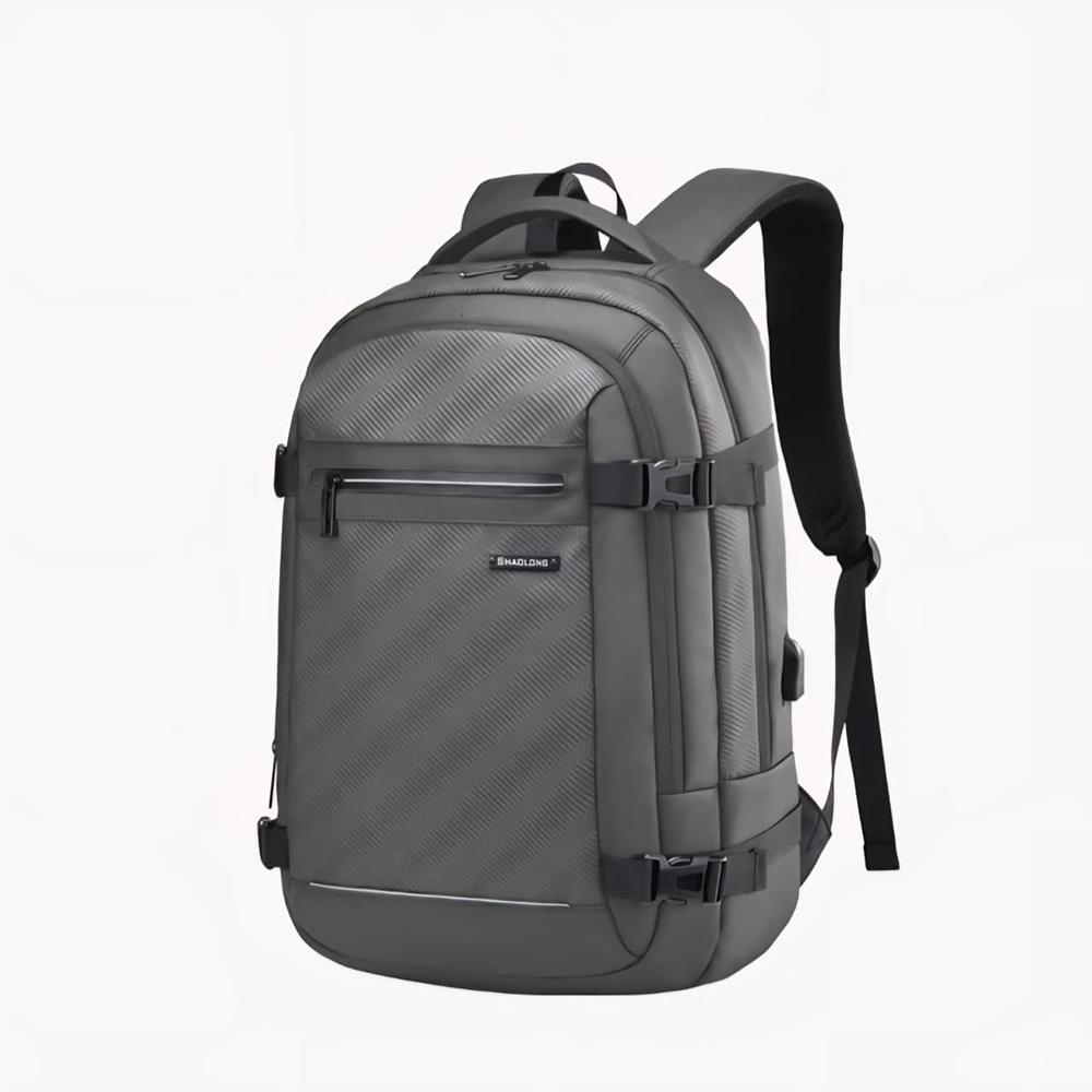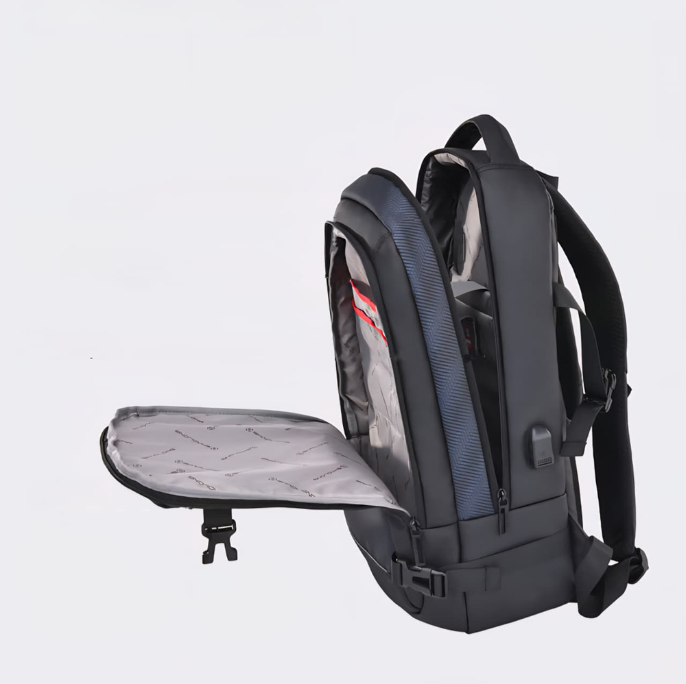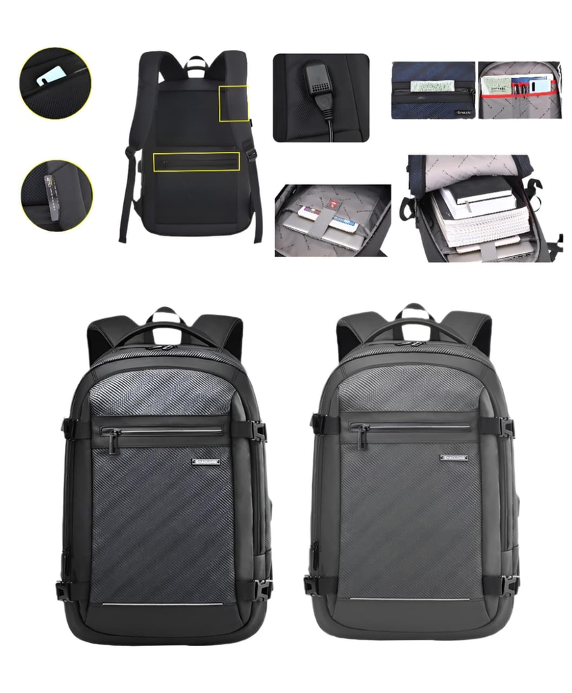(Mochila funcional de hombre en color gris o negro. Diseñada con un compartimiento amplio con dos bolsillos internos, dos bolsillos frontales (uno de ellos con dos bolsillos internos) y un bolsillo anti-robo en la parte trasera. El mismo está realizado con materiales de excelente calidad y cuenta con cinta para colocar en la valija a la hora de viajar, cable USB, espalda y tiras acolchonadas para mayor comodidad durante su uso).