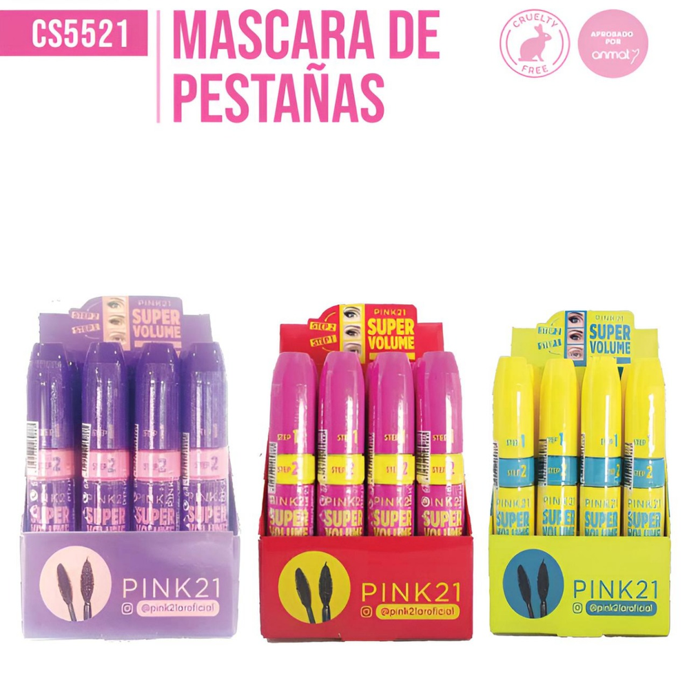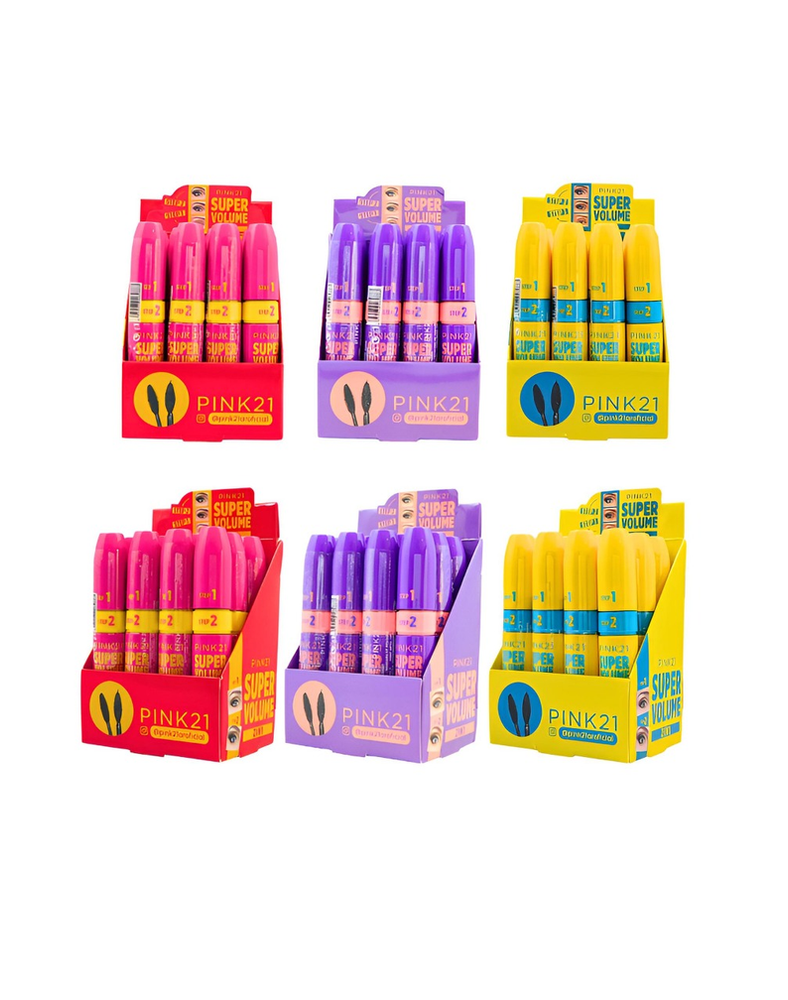 ( Caja x 12U. de Mascara para pestañas "Super Volumen" de Pink 21, disponible en 3 colores distintos de envase. La máscara es de color negro y tiene un diseño de dos pasos para su aplicación. Su fórmula está diseñada para dar volumen y definición a las pestañas).