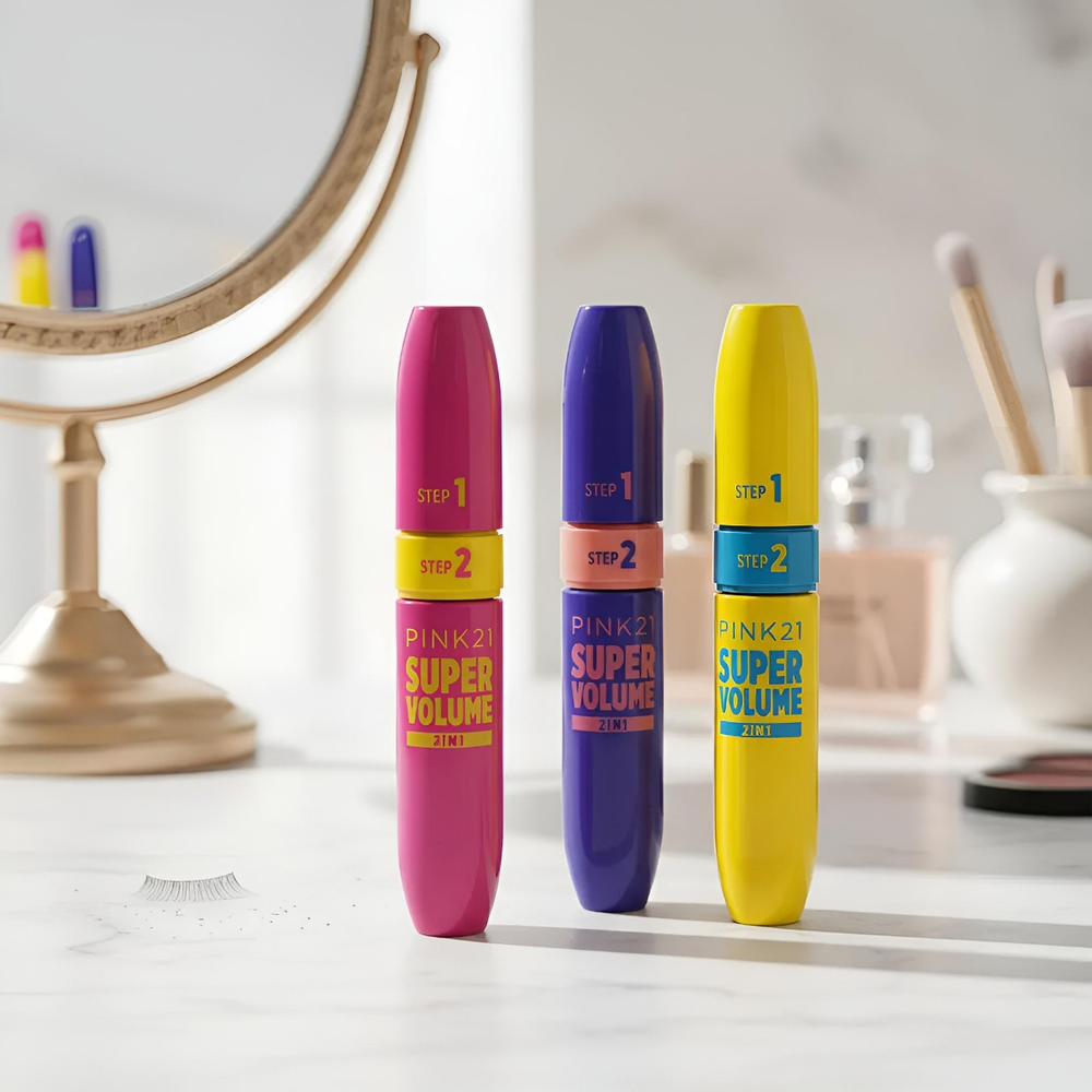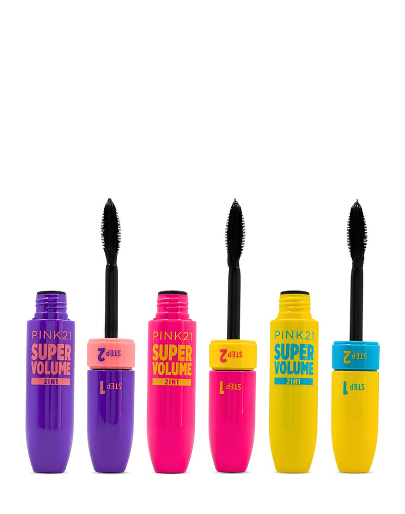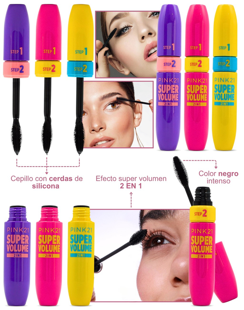 (Mascara para pestañas "Super Volumen" de Pink 21, disponible en 3 colores distintos de envase. La máscara es de color negro y tiene un diseño de dos pasos para su aplicación. Su fórmula está diseñada para dar volumen y definición a las pestañas).