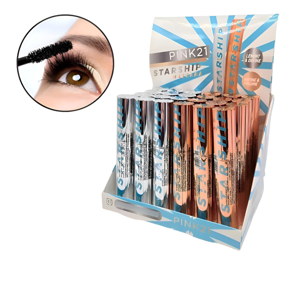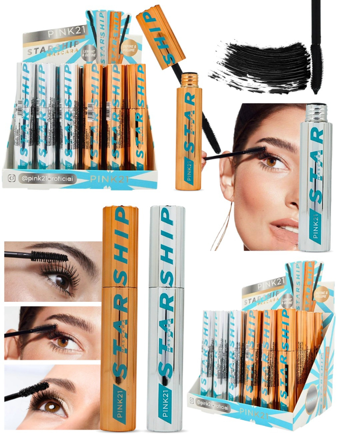 (Caja x 24U. Mascara de Pestañas Starship de Pink 21, un producto de maquillaje diseñado para definir, dar volumen y alargar las pestañas. Cepillo Dorado: Proporciona definición y volumen a las pestañas. Cepillo Plateado: Se utiliza para alargar y definir las pestañas. La fórmula está diseñada para lograr pestañas con volumen, definición y alargamiento en una sola aplicación, evitando grumos).