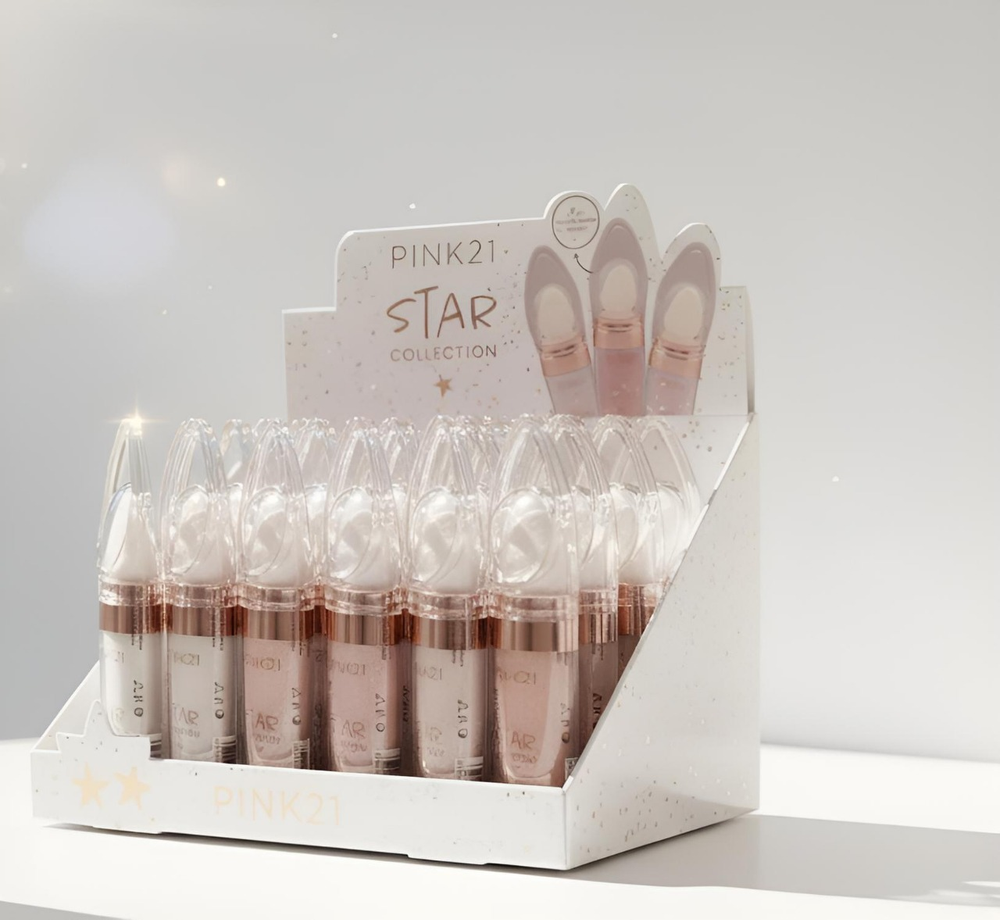 (Caja x24U. Polvo de hadas ''PINK 21' iluminador multifuncional para rostro y cuerpo. Viene en un envase con una esponja en la punta para facilitar la aplicación. Se puede usar en el rostro, el cuerpo, el cabello e incluso sobre la ropa. Disponibles en 3 tonos: blanco, rosa o dorado).