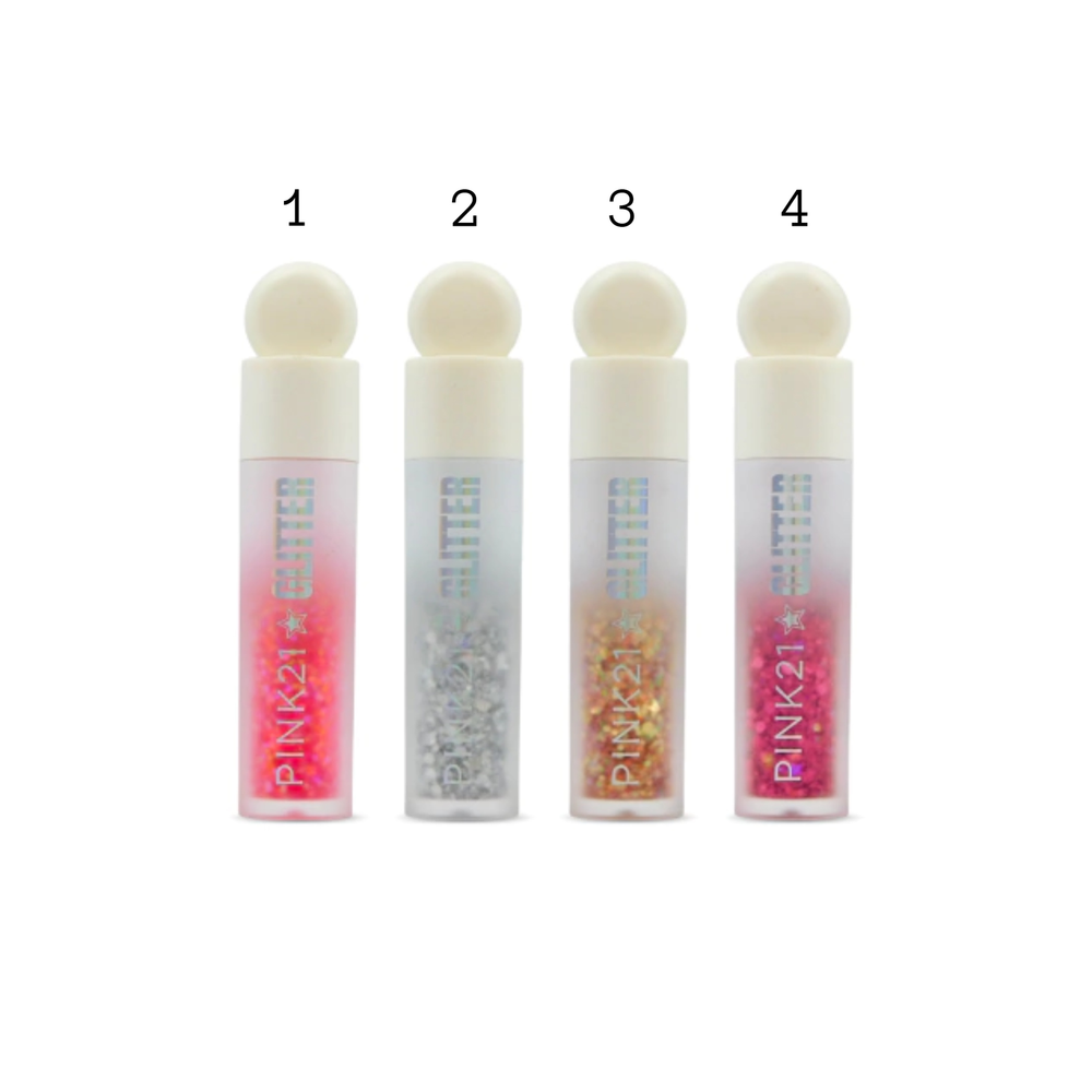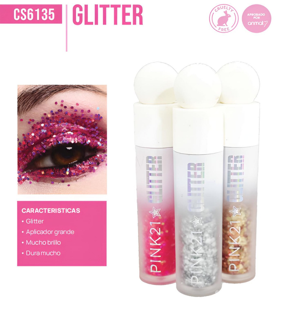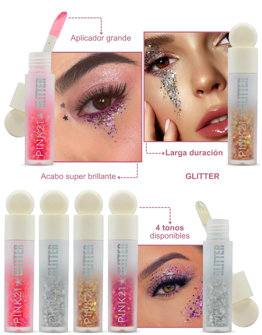 (Glitter con mucho brillo, larga durabilidad y un aplicador grande para facilitar su uso. Las sombras con glitter de Pink 21 son ideales para crear looks llamativos y tienen una pigmentación intensa).