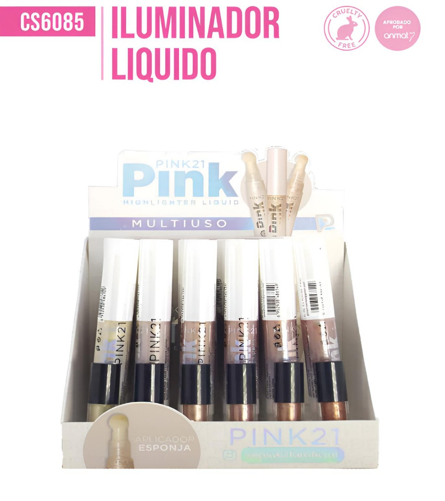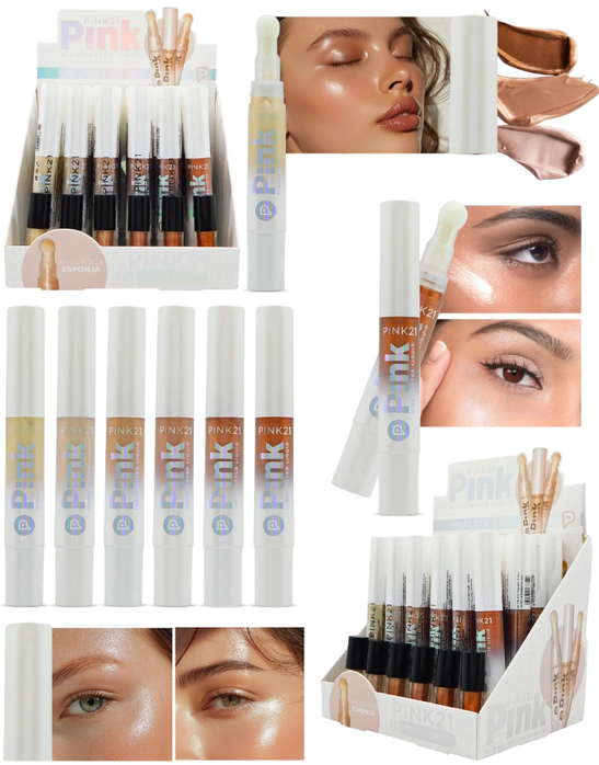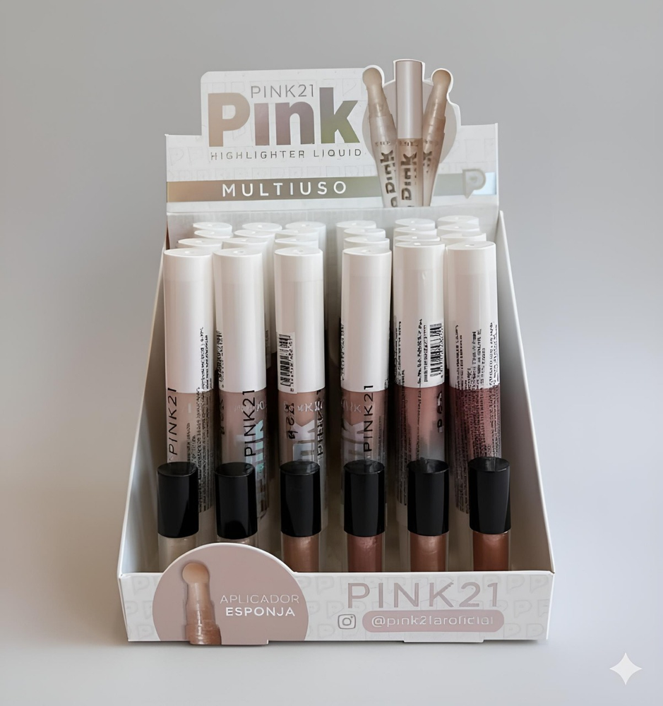 (Caja x 24U. Iluminador Líquido "Pink 21" de 6 tonos diferentes a elección para cualquier ocasión. Dejando un increíble brillo natural. Sirve para realzar la luminosidad natural del rostro y darle un acabado radiante. Su fórmula ligera y versátil permite aplicarlo en diversas zonas para resaltar y atraer la luz).