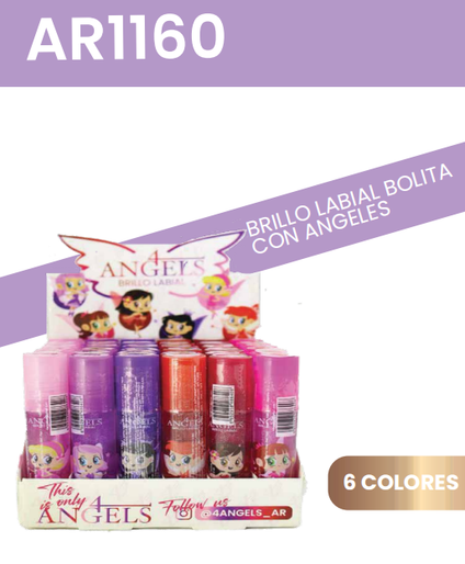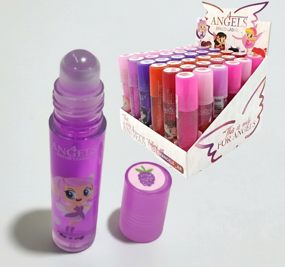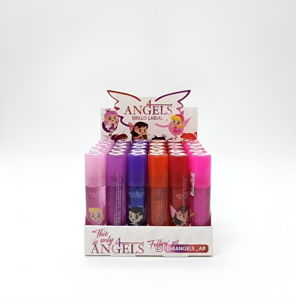 (Caja x36U. Brillo Labial "4 Angels". Este brillito cuenta con 6 opciones diferentes. Cada uno con un rico aroma frutal. Ideal para que tus labios brillen al natural).