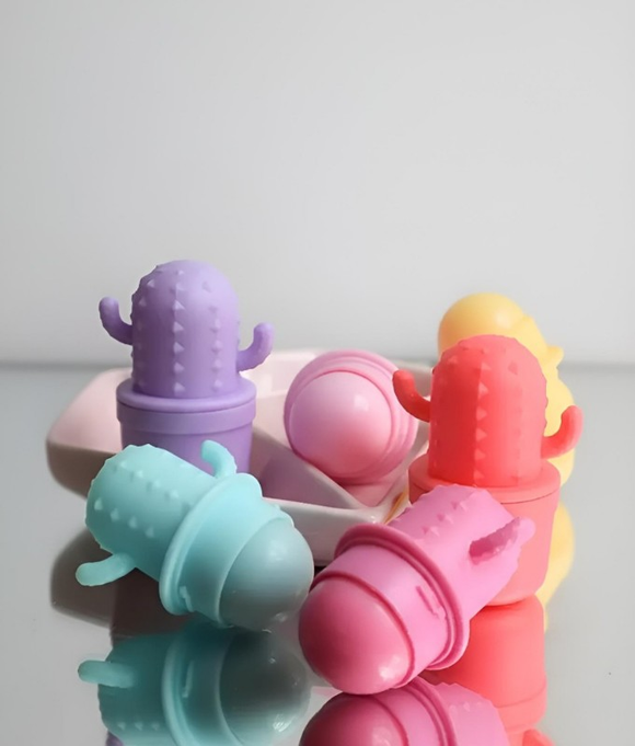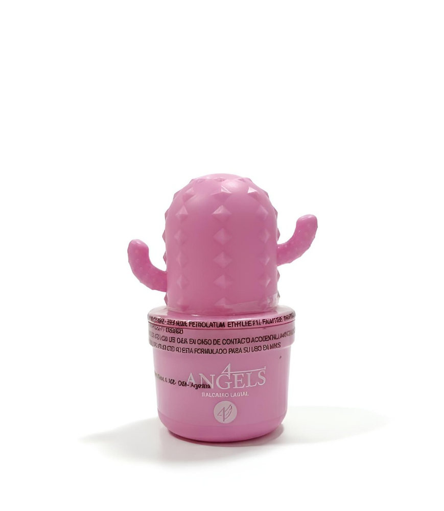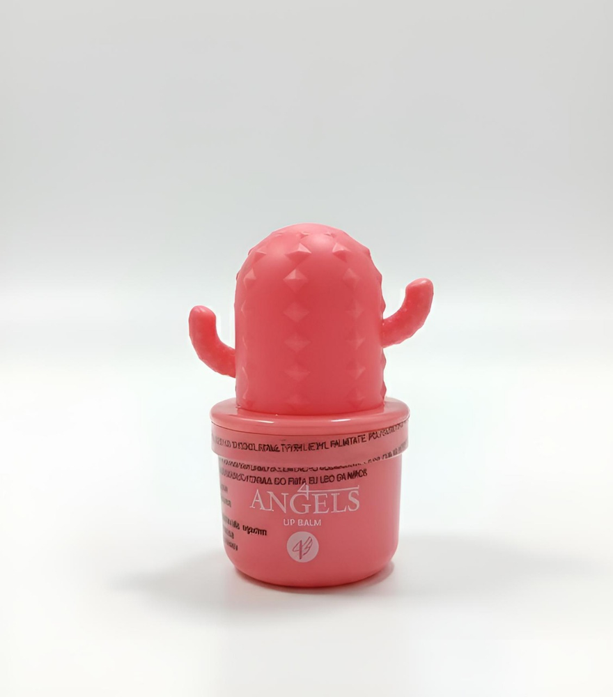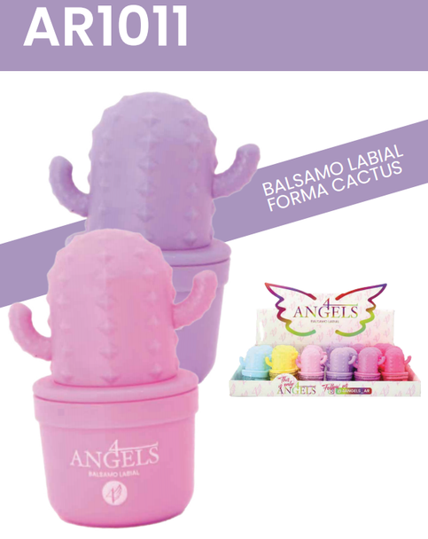 (Bálsamo labial en envase en forma de cactus"4 Angels". Este bálsamo cuenta con 6 opciones diferentes. Cada uno con un rico aroma. Ideal para que tus labios brillen al natural y se mantengan hidratados).