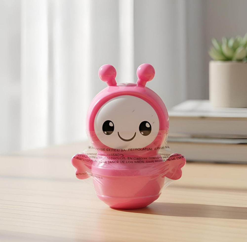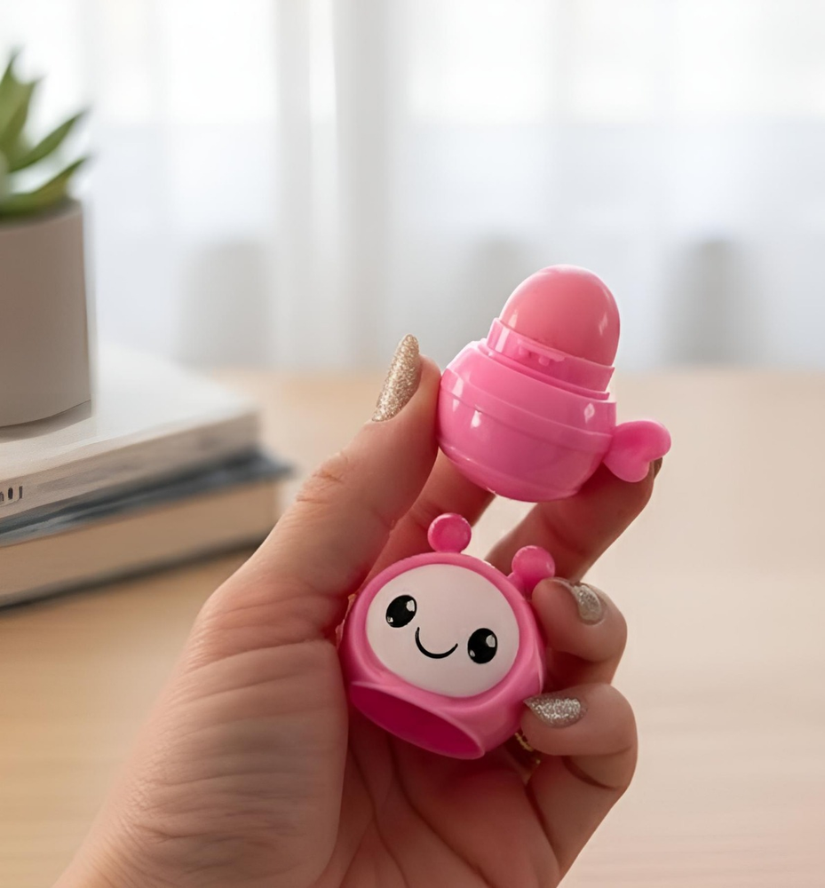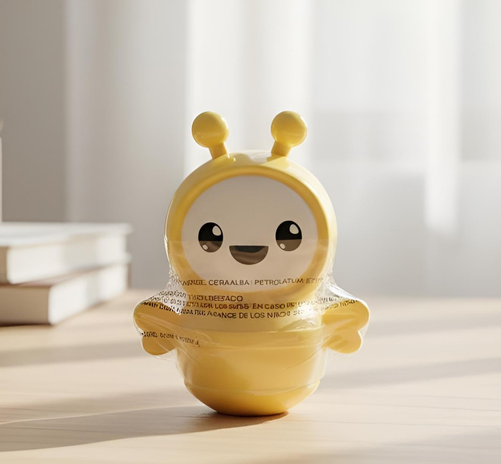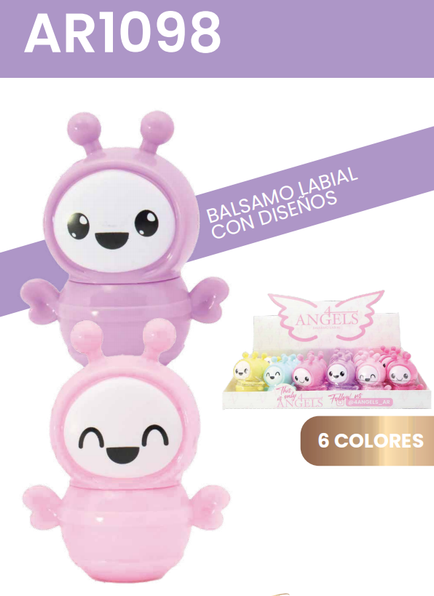 (Bálsamo labial en envase en forma de abejitas "4 Angels". Este bálsamo cuenta con 6 opciones diferentes. Cada uno con un rico aroma. Ideal para que tus labios brillen al natural y se mantengan hidratados).