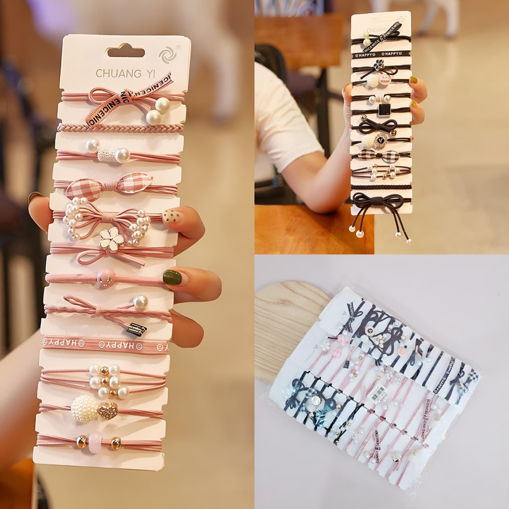 (Blister con 12U. de colitas, 6 de color negro y 6 de color rosa con diferentes dijes y detalles).