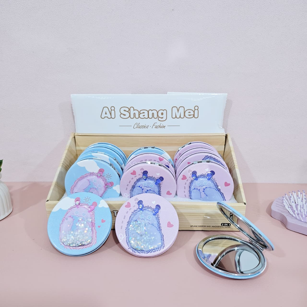 (Caja x 12U. Espejo con Glitter, diseño super tierno. Cuenta con dos espejos uno con aumento y otro normal. ideal para llevarlo a todos lados).