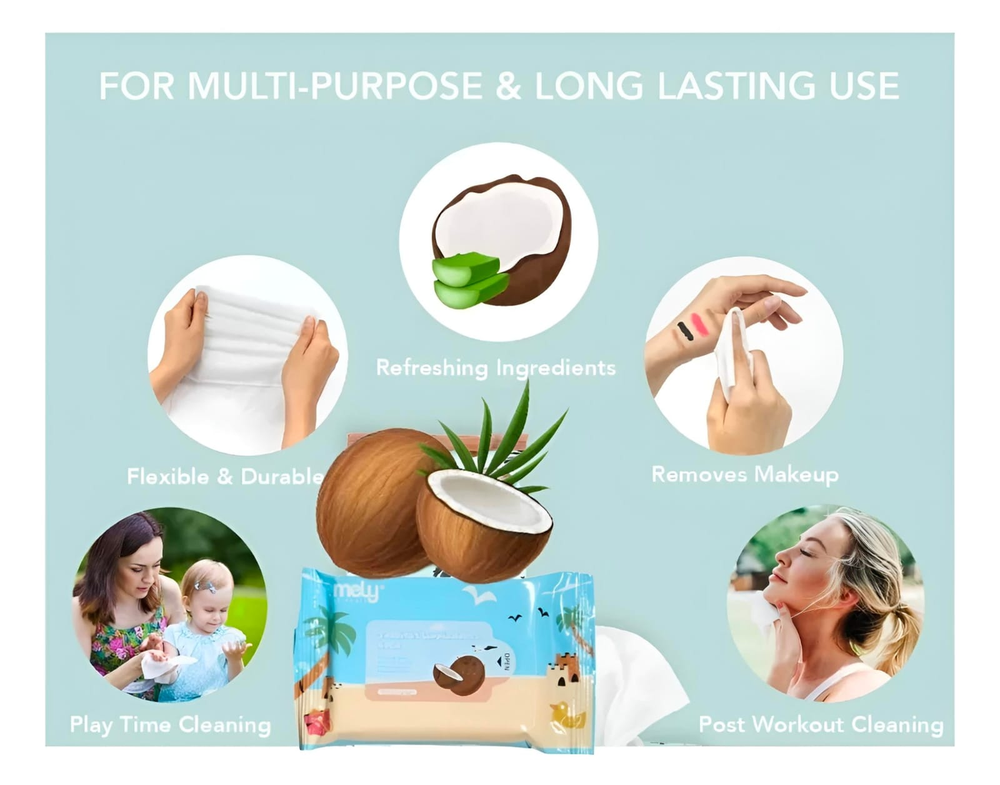 (Toallitas Desmaquillantes de Coco "Mely". Estas toallitas contienen 10 de ellas Ideales para desmaquillar y cuidar tu piel dándote hidratación).