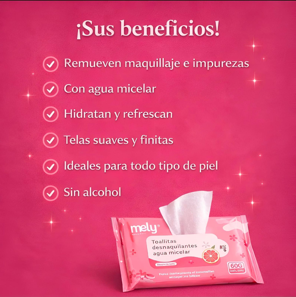 (Toallitas Desmaquillantes de Pomelo "Mely". Estas toallitas contienen 10 de ellas Ideales para desmaquillar y cuidar tu piel dándote hidratación).