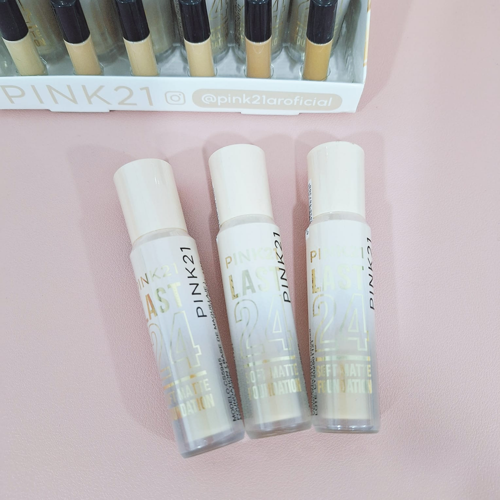 (Base de Maquillaje "Pink 21" con acabado mate suave y textura fluida que ofrece alta cobertura. 6Tonos diferentes a elección).