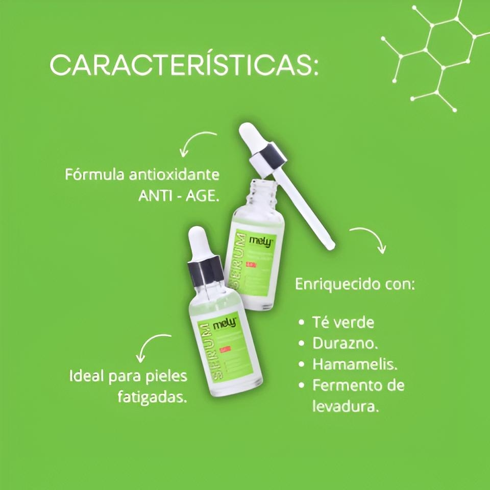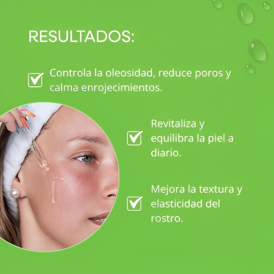 (Purifica y revitaliza tu piel con este sérum natural. Su fórmula con té verde, durazno, hamamelis y fermento de levadura controla oleosidad, reduce poros y calma enrojecimientos, dejando un rostro equilibrado y fresco).