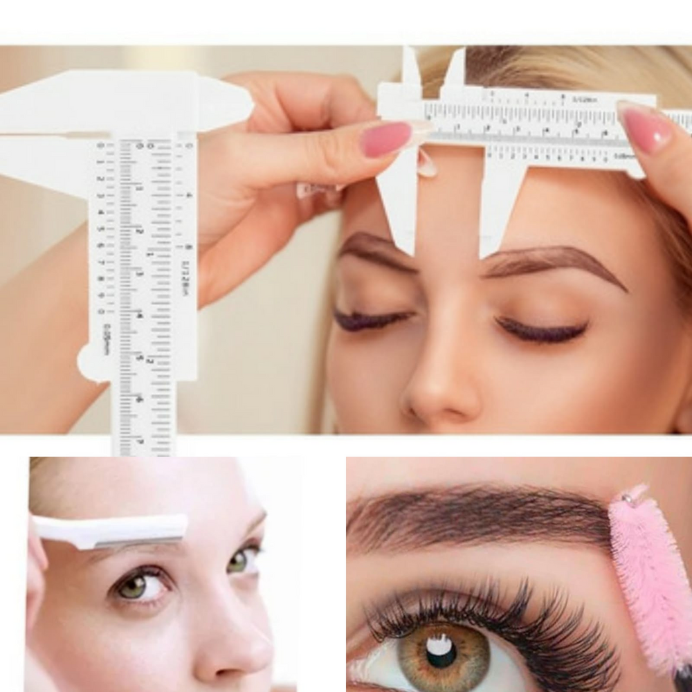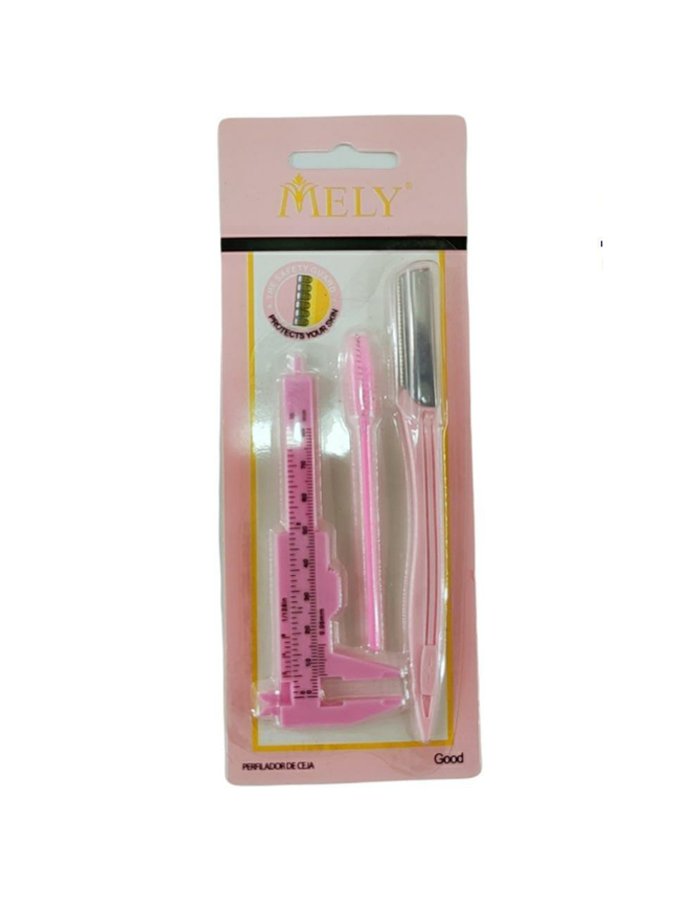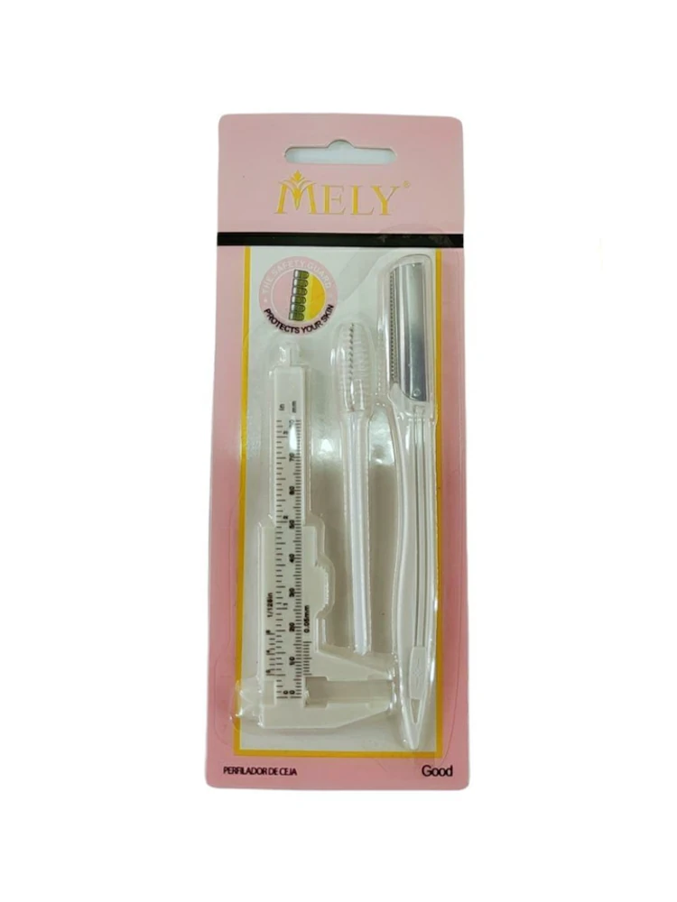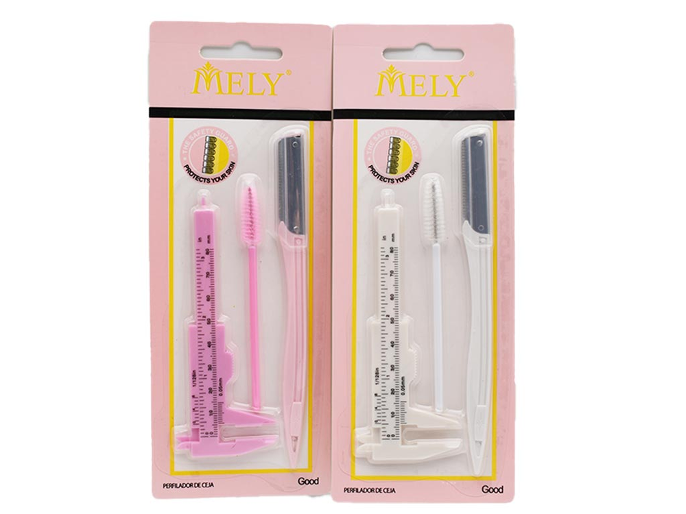 (kit de perfilador de cejas, por 3 unidades: cepillo para peinar las cejas, para medir las cejas y maquinita para afeitar las mismas. Categorizado en artículos para pestañas y cejas).