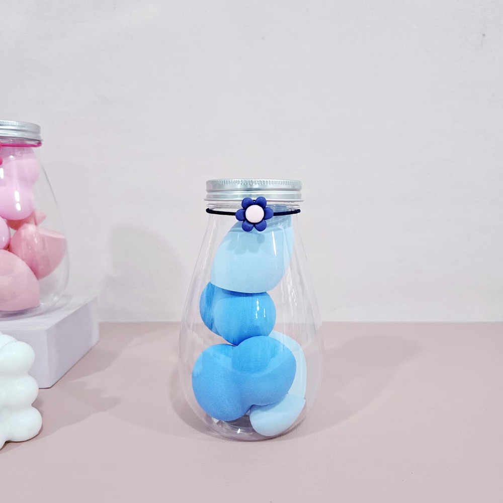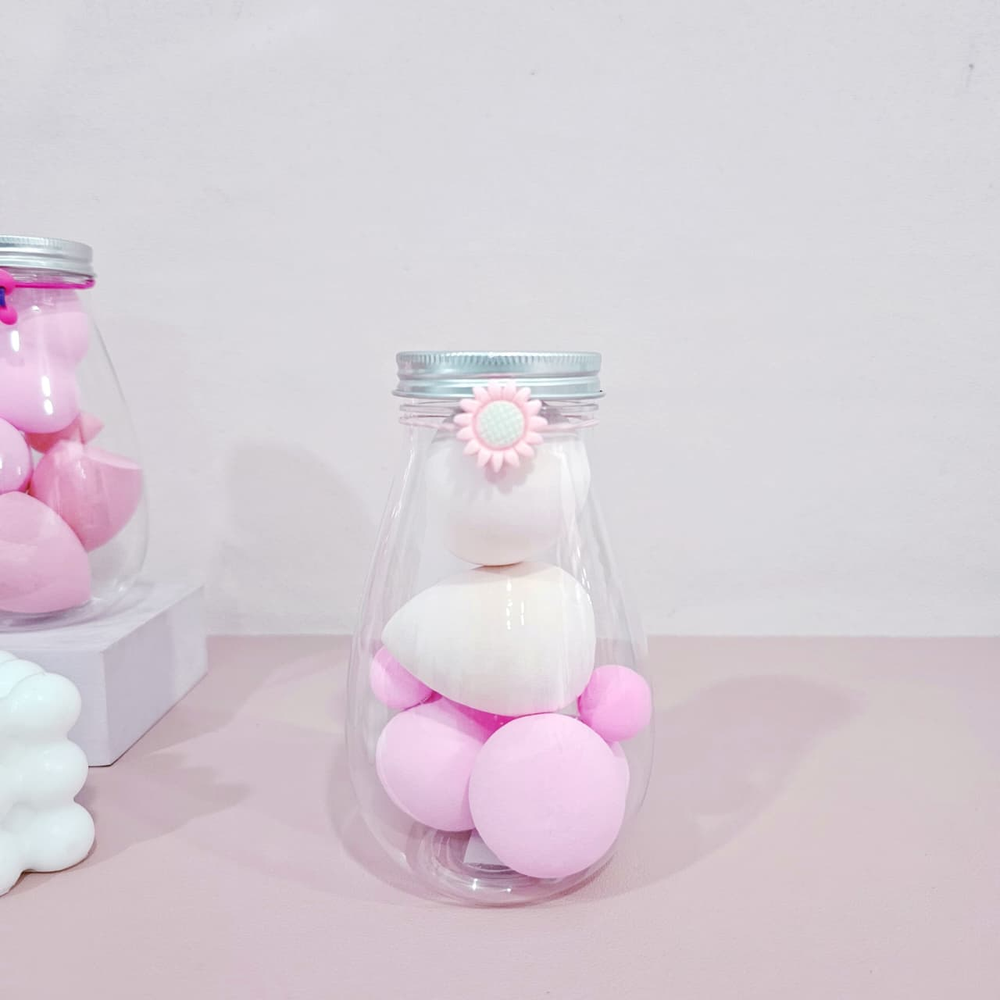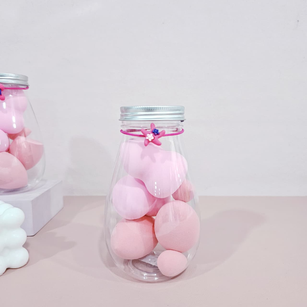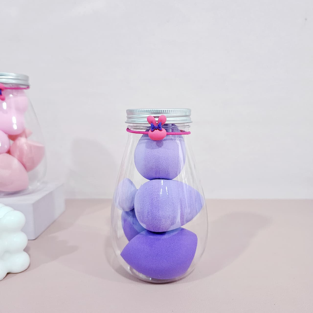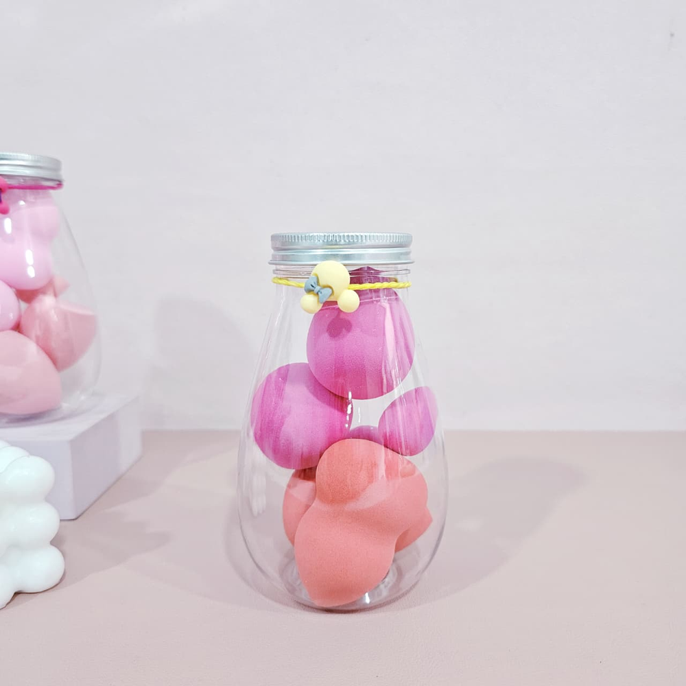 (Frasco con 6 esponjas para maquillaje de distintos tamaños y modelos, ideales para cada zona del rostro,las esponjas son lavables y reutilizables. El frasco en forma de gota con tapa a rosca y una colita con dije como decoración).