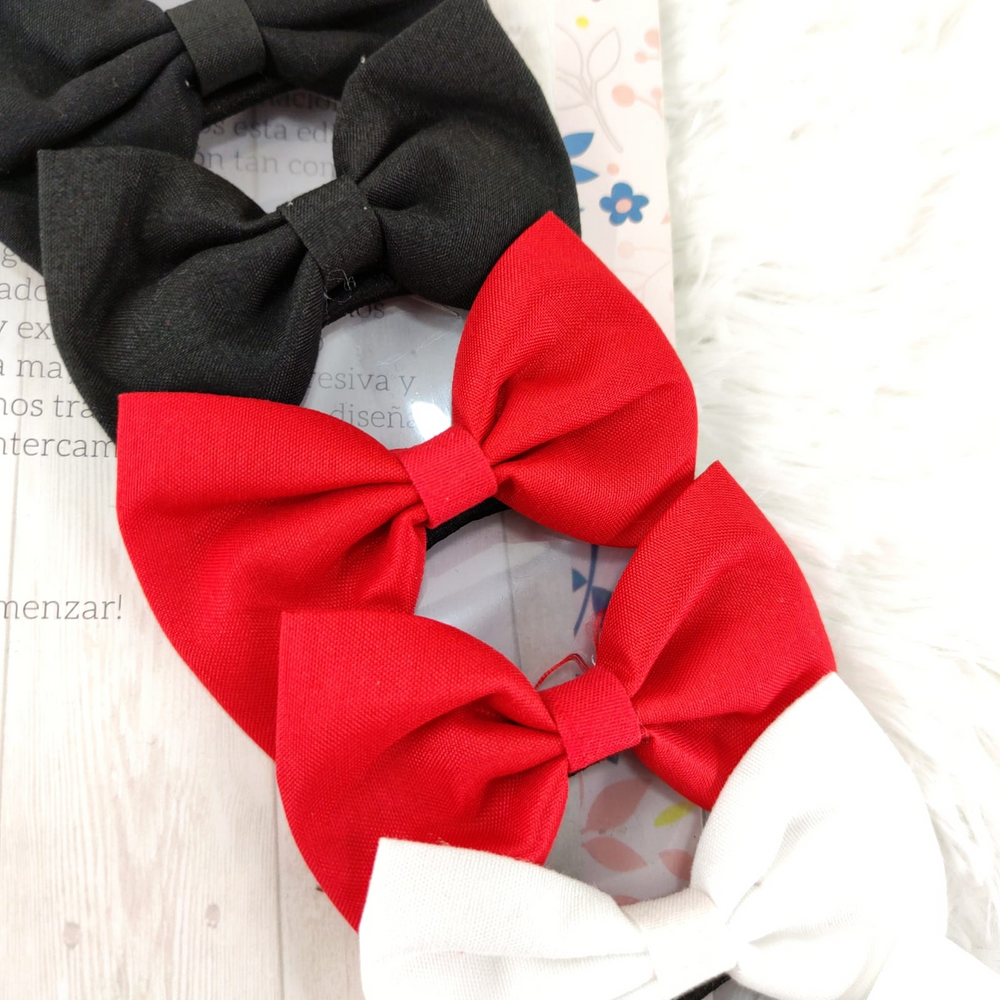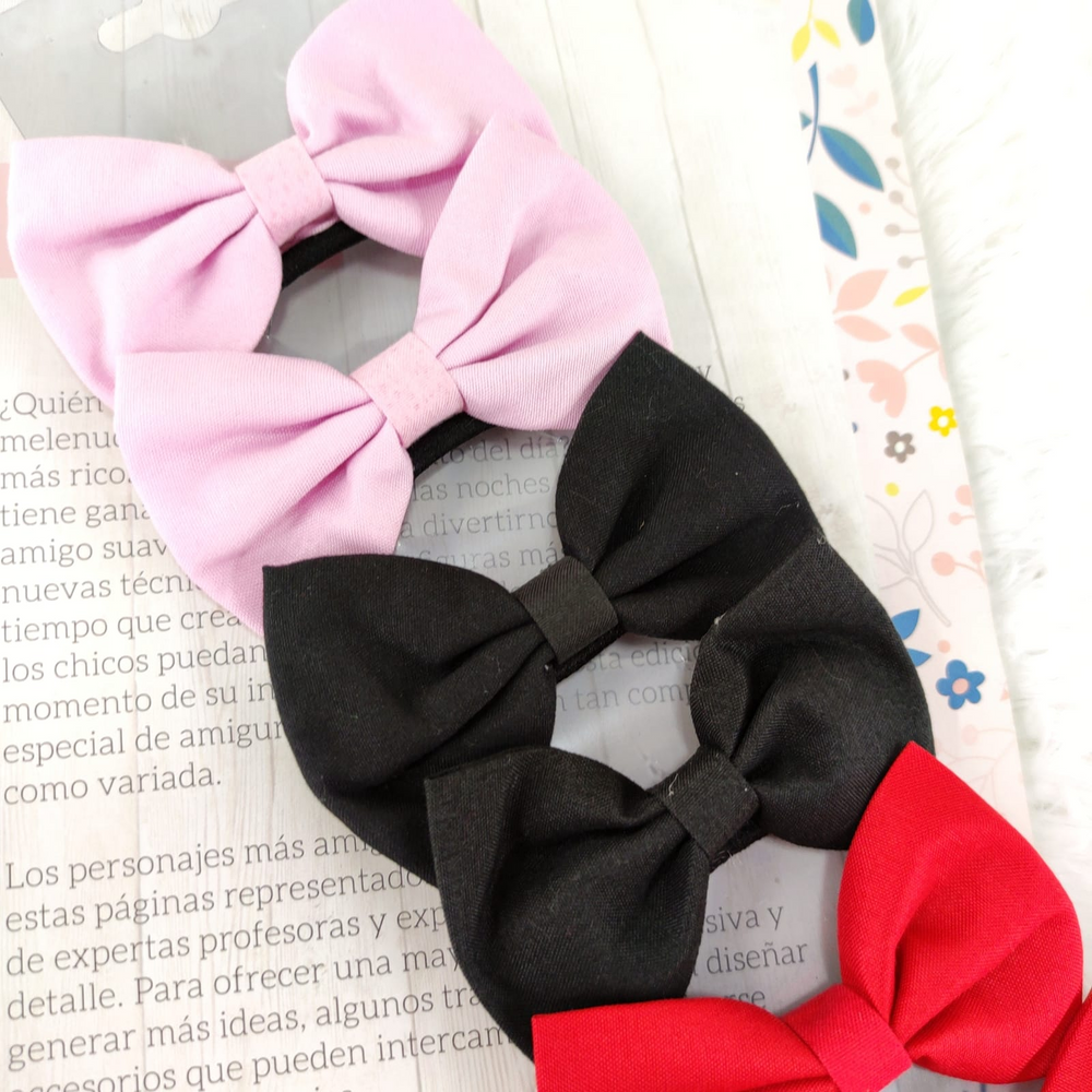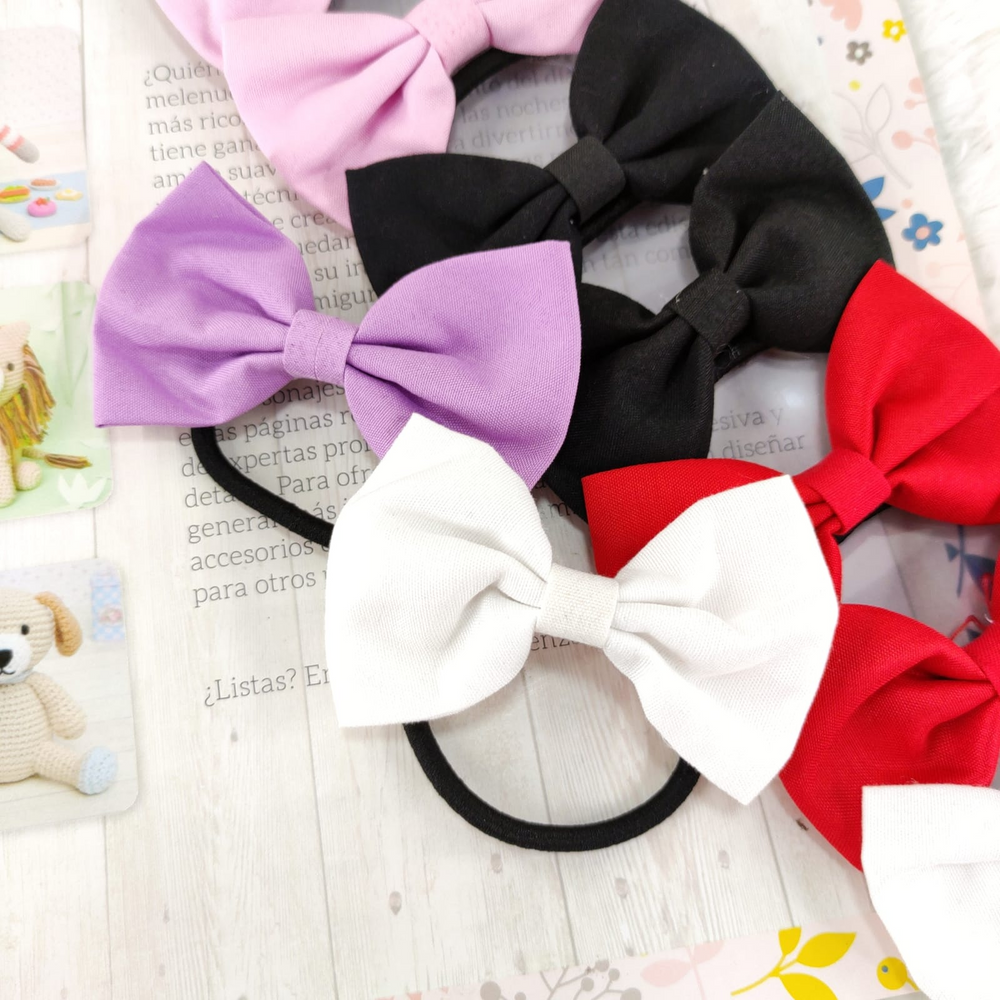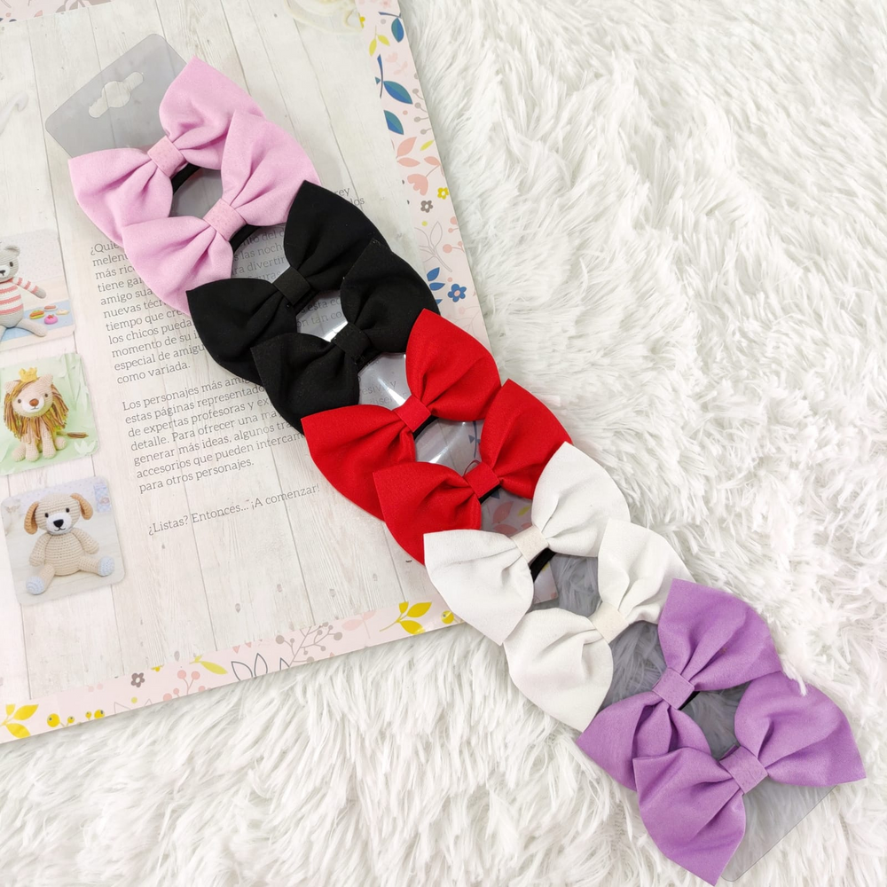 (Blíster de 10 colitas con moño de tela en colores surtidos -rosa, negro, rojo, violeta, blanco-. Ideales para cualquier tipo de peinado. Tamaño medio y de gran elasticidad. Categorizados en accesorios para el pelo)