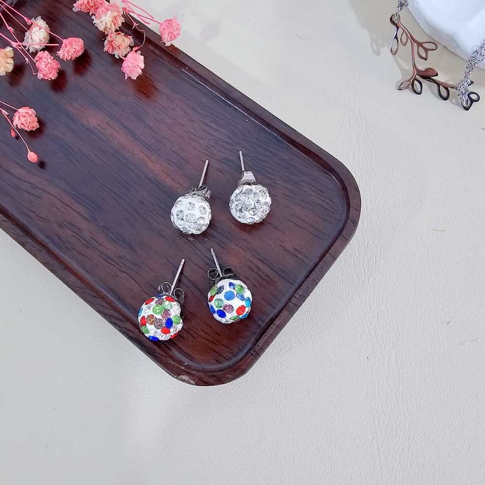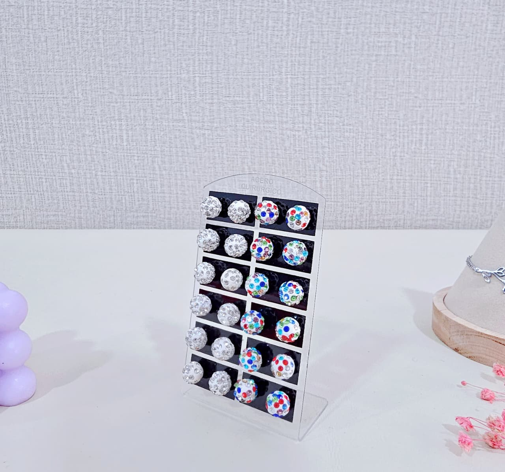 (Blíster de aritos x 12 pares de mini bolitas de fuegos. Lleva una fila de de 6 pares colores blancos con strass y la otra multicolores con strass.